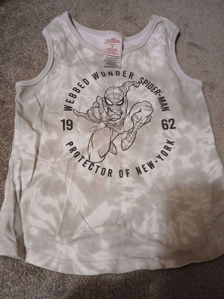 Spiderman tank top in size 6. Features a cool design with Spiderman, "Webbed Wonder Spiderman", and "Protector of New York". Great for any young Spiderman fan! size 6