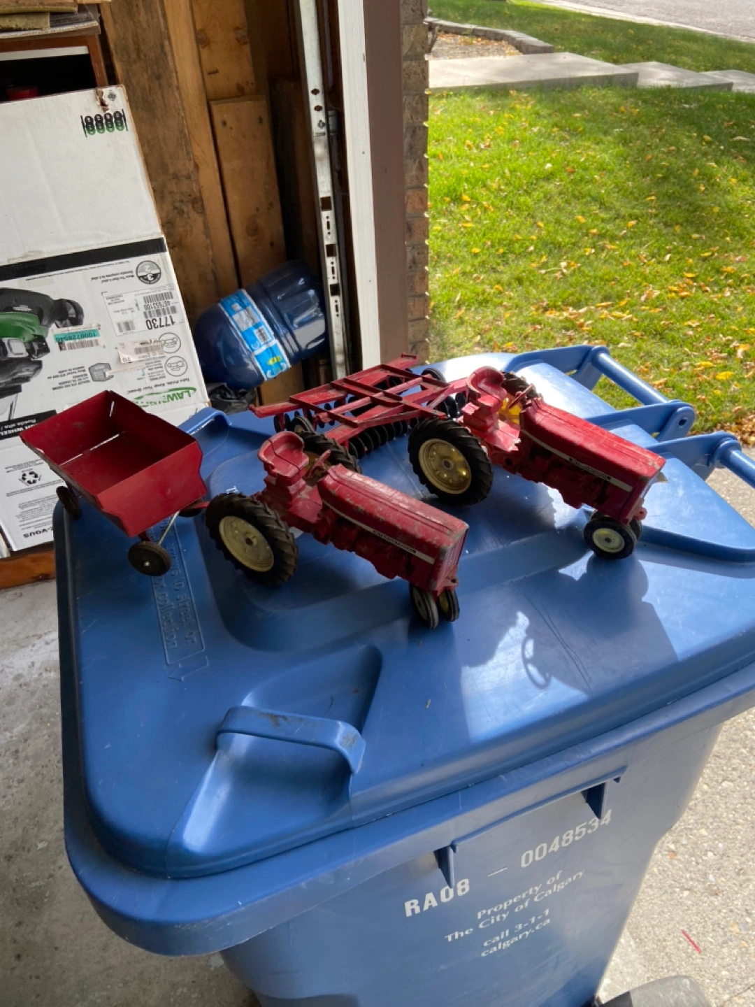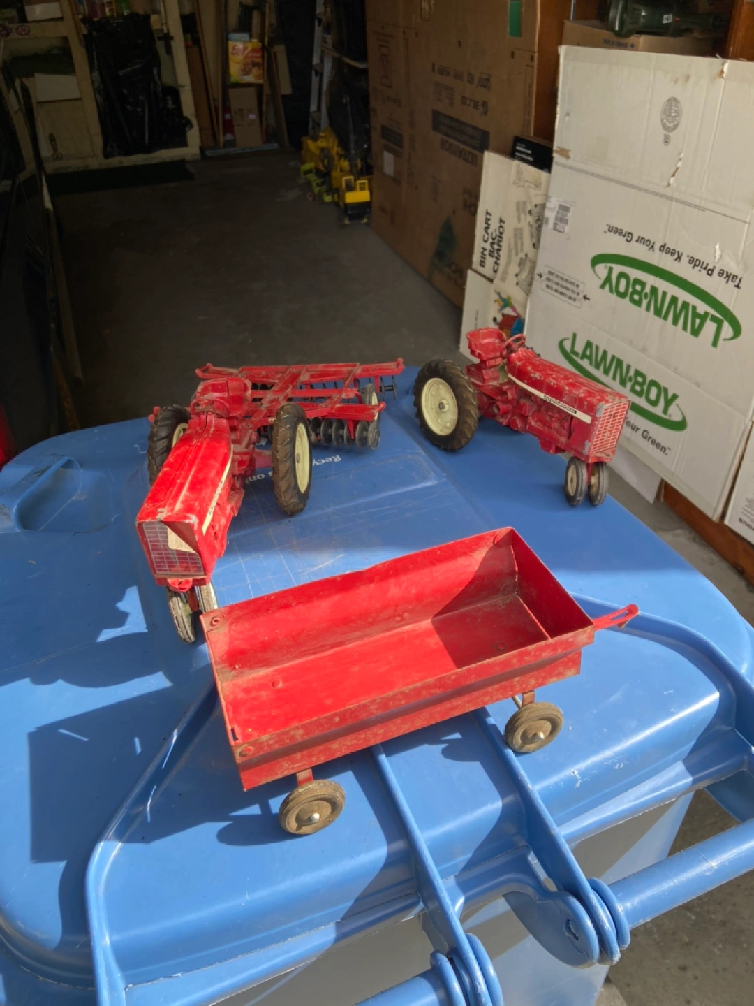 Selling a vintage toy tractor set. It includes a tractor, a trailer, and a plow. Perfect for collectors or kids who love farm toys!