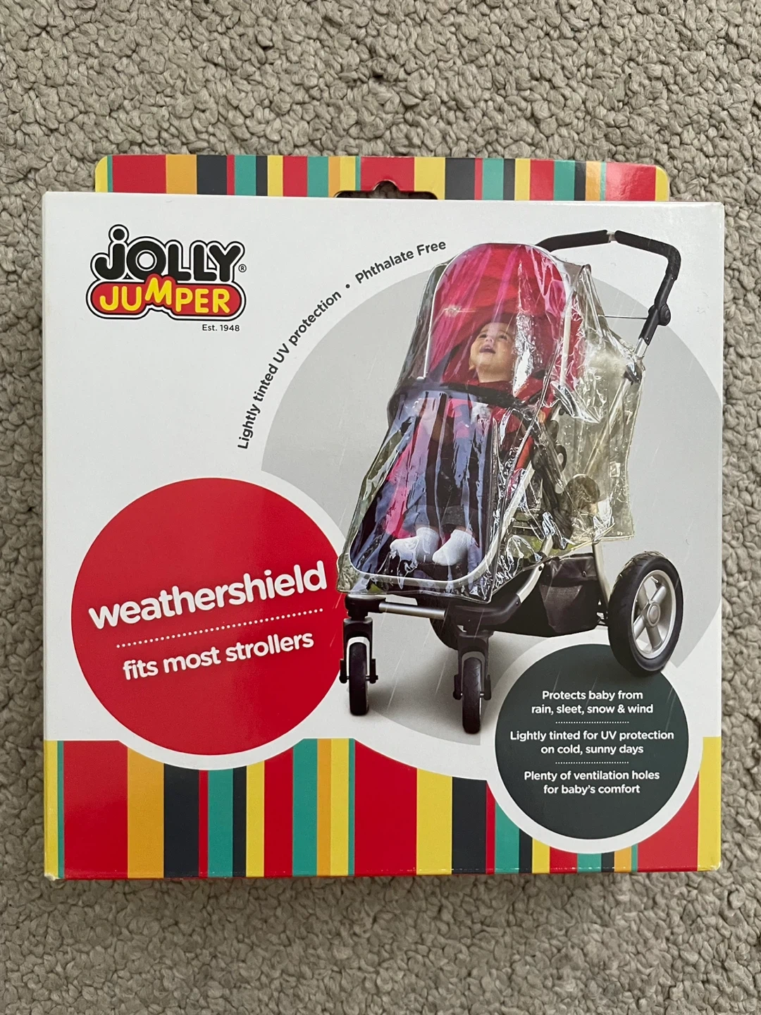 Keep your little one protected from the elements with this Jolly Jumper Weathershield! It fits most strollers and provides UV protection. It also protects baby from rain, sleet, snow & wind. Lightly tinted for UV protection on cold, sunny days, and plenty of ventilation holes for baby's comfort. Box is included