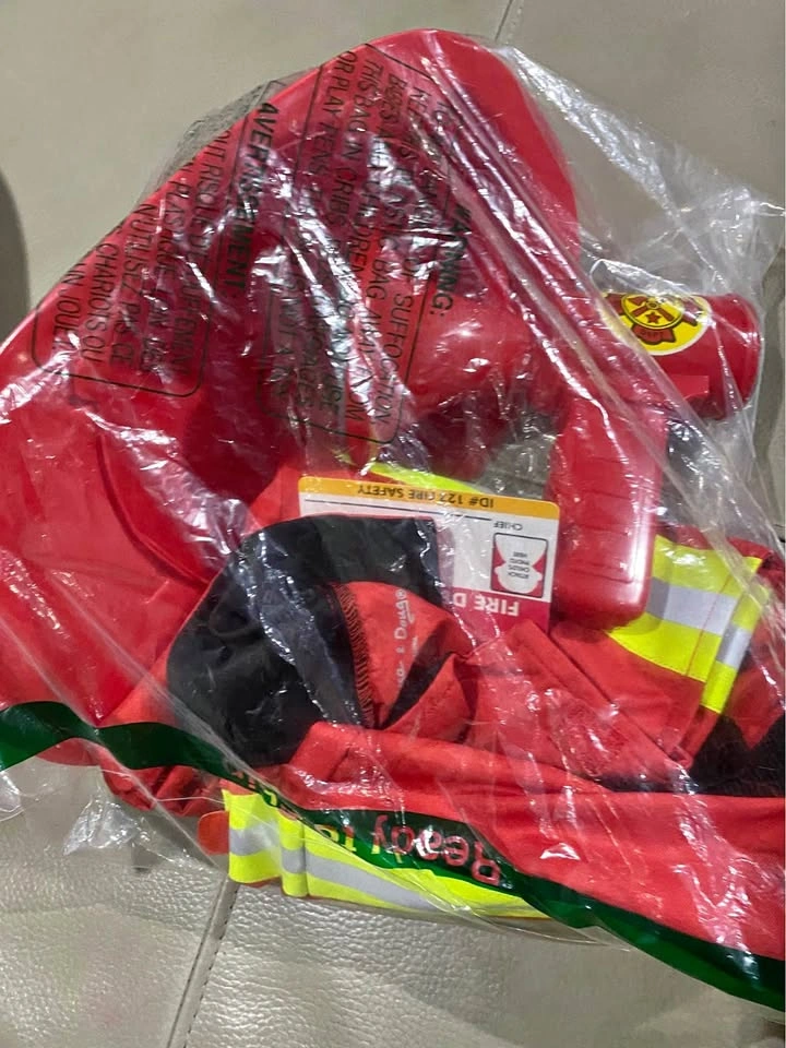It comes with a bright red, machine-washable jacket trimmed with reflective material, a fire chief helmet, a bullhorn and a shiny badge, and a name tag to personalize. Only used once. Age: 3 to 5 years old (3T-5T). Location is Lawrence and Bellamy. Cash only. Final Sale