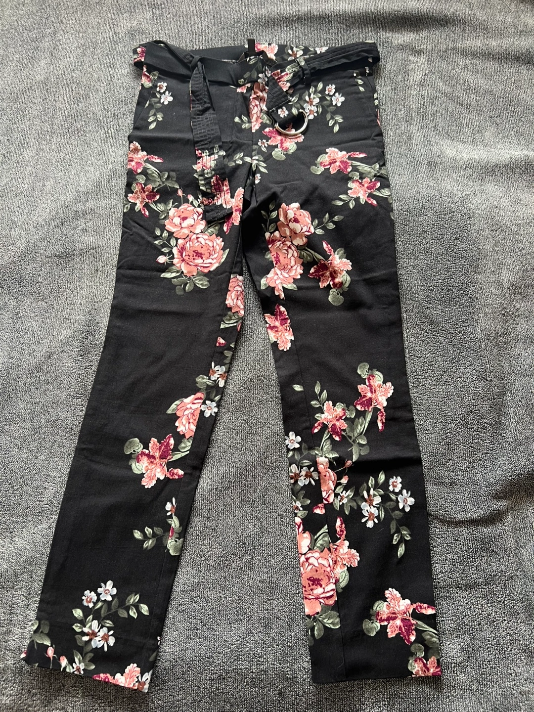 Cute floral print pants in black with a matching belt! They're in great condition and ready for a new home. The floral design features pink and white flowers, making them perfect for spring or summer. They have a stylish and unique look!