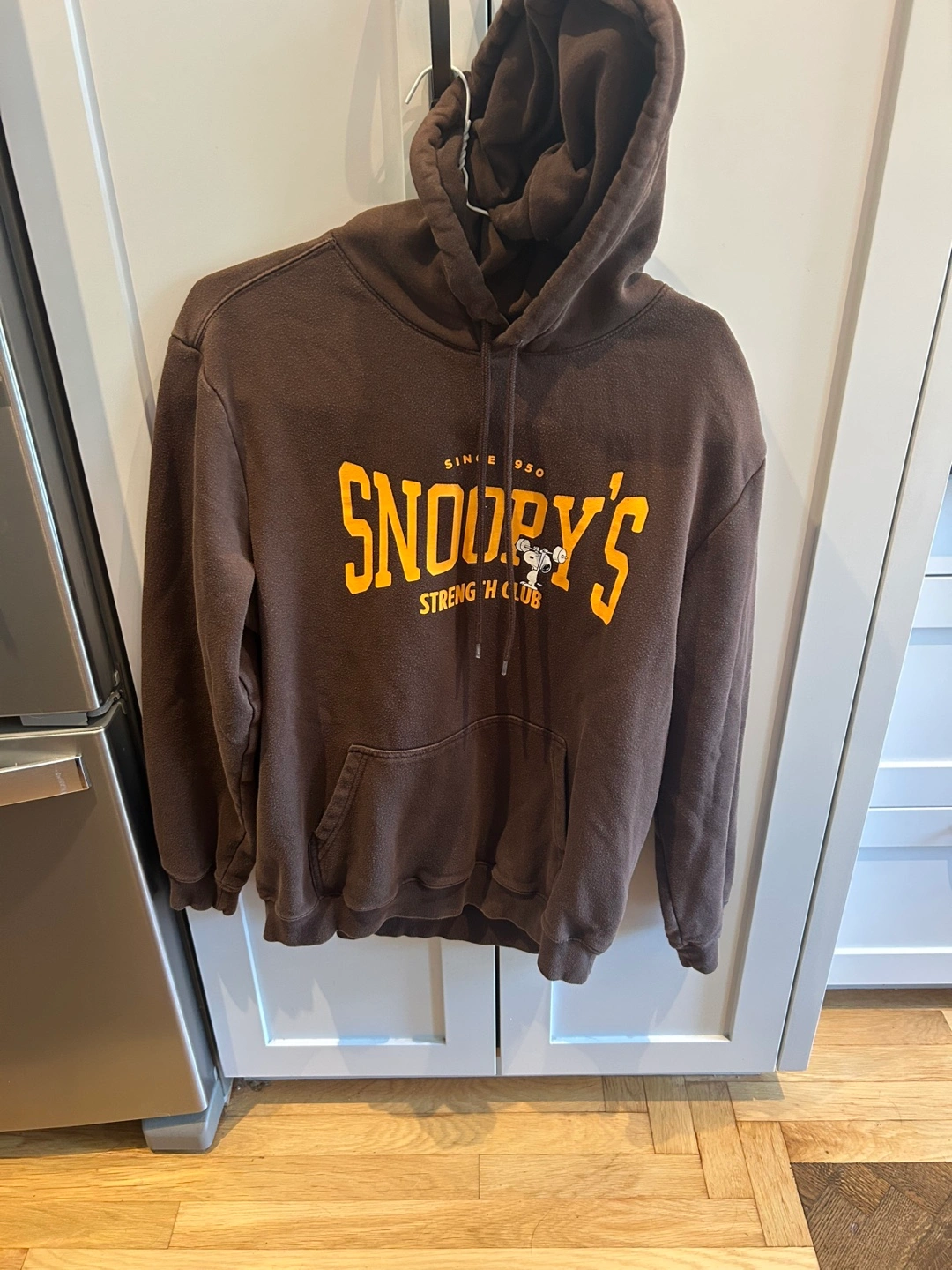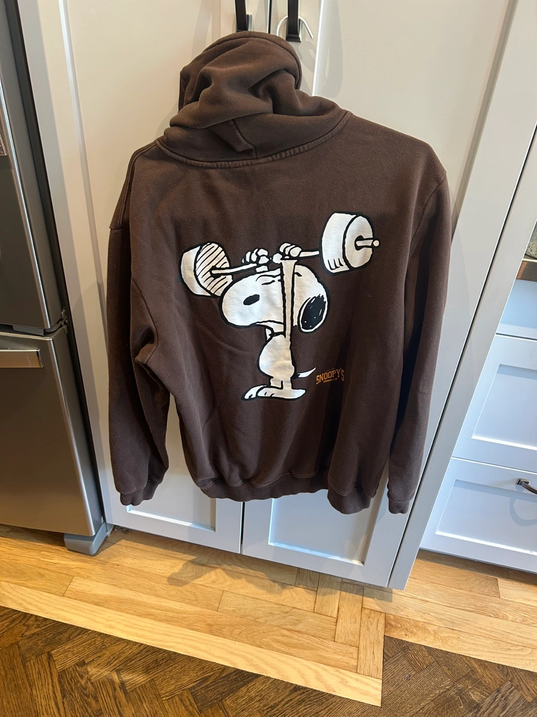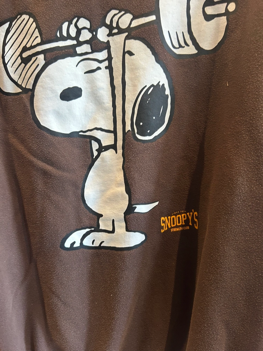 Here's a cozy brown hoodie featuring Snoopy's Strength Club! It has a fun design on the front and back. Perfect for casual wear or lounging around the house