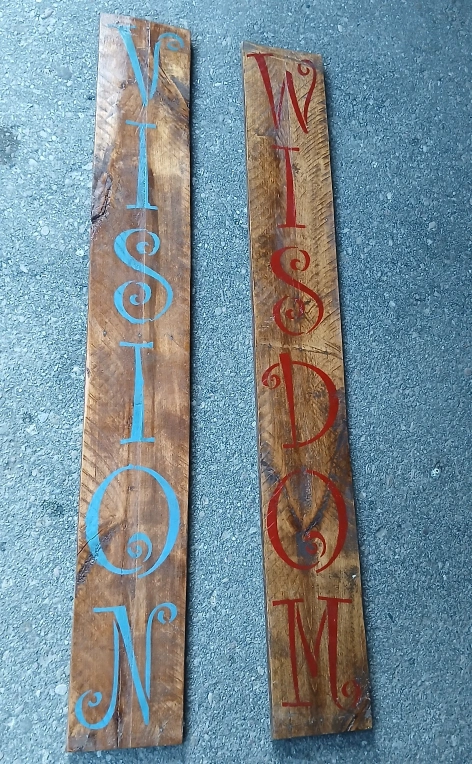Selling a set of handmade wooden signs. One says "Vision" in blue lettering, and the other says "Wisdom" in red lettering. They'd make a lovely addition to any home! 42 inches long