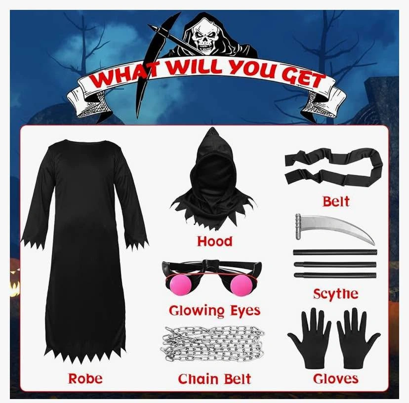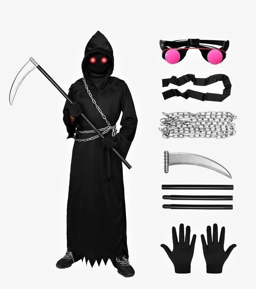The length of the suit is 46 inches. It comes with the glowing glasses, scythe, black gloves, chain and belt. Suitable for 8-12 year olds depending on build. Final sale. Cash only.