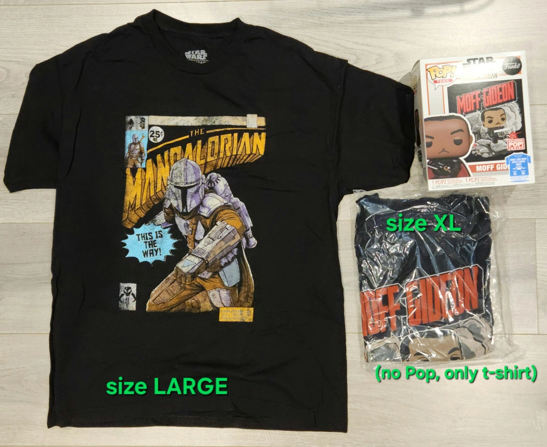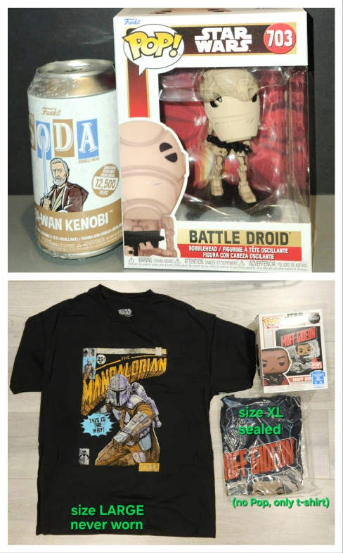 Hi there! - yes, the bundle pictured is 100% available, no need to ask, only to message to pick up or ask any questions based on listed photos - located at M8V 1G5 & I will provide the full address if you are interested in picking up. Not offering shipping. Kindly asking for cash upon purchase. Price is firm. However, I am offering bundle deals and discounts if you're looking to purchase other items from my listings. Please see below - please be kind and respectful :) Take all for $39! Or individual prices listed below next to each item: Included in this bundle are: Battle Droid Funko Pop - Star Wars Episode 1 The Phantom Menace ($16) Sealed Obi-Wan Kenobi - Star Wars Episode 4 A New Hope ($12) Sealed Target Exclusive Star Wars The Mandalorian Moff Gideon (XL) Funko Pop Tee+collectors box pictured ($10) Brand new never been worn The Mandalorian Comic Cover Style Graphic T-Shirt (L) ($10) Check out my listings for more collectibles, comics, cards, sports memorabilia, Funko Pops and SODA, and much more. No trades. Thank you for taking the time to read the description.