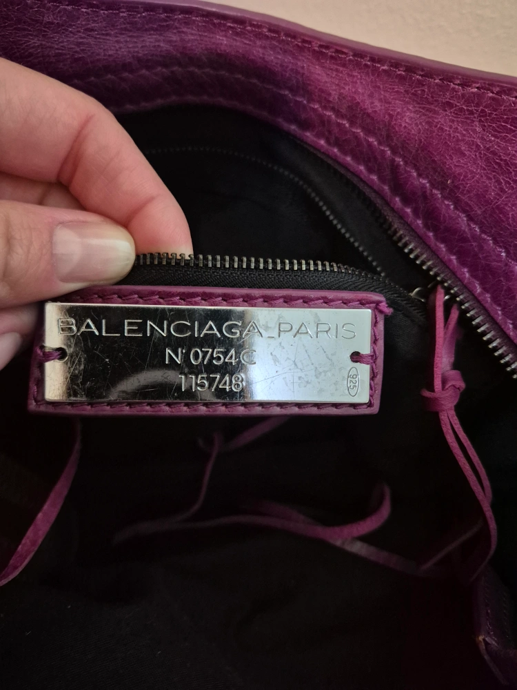 Selling a lovely purple leather handbag from Balenciaga Paris. It has a unique design and is made of high-quality leather. It's in good condition and ready for a new home!