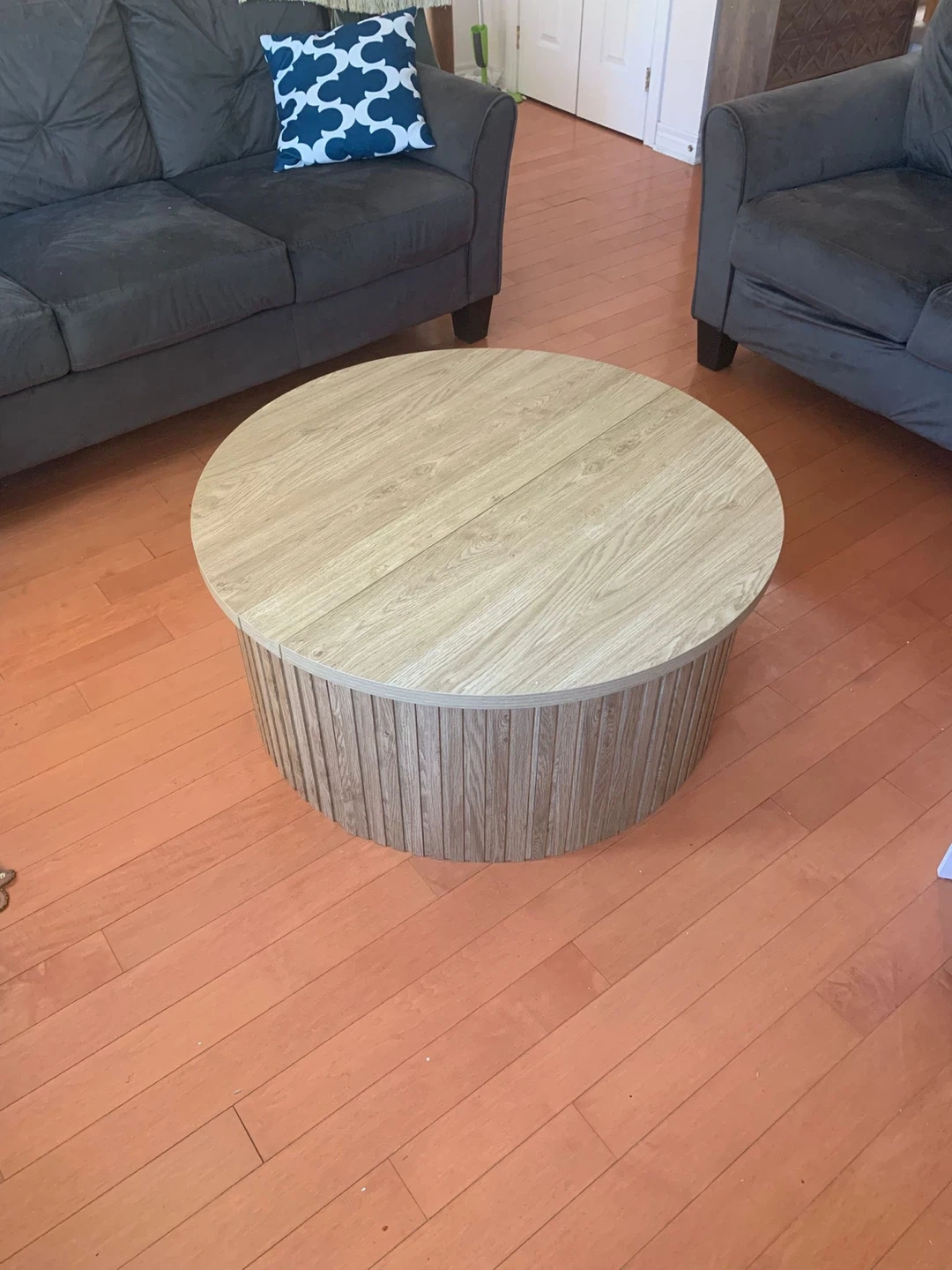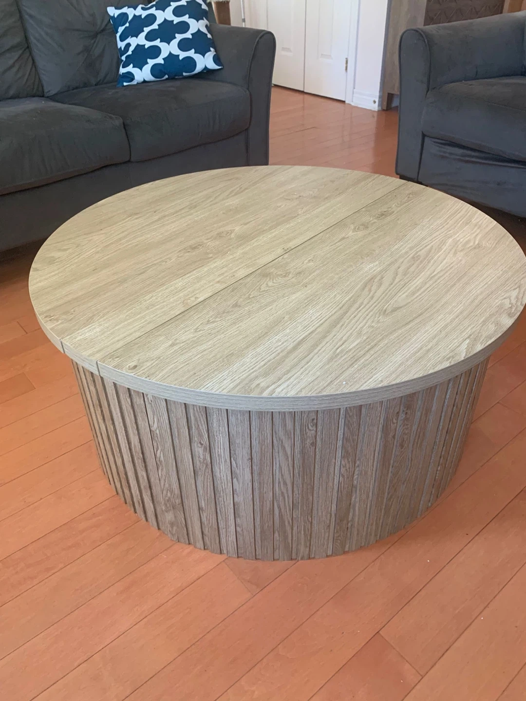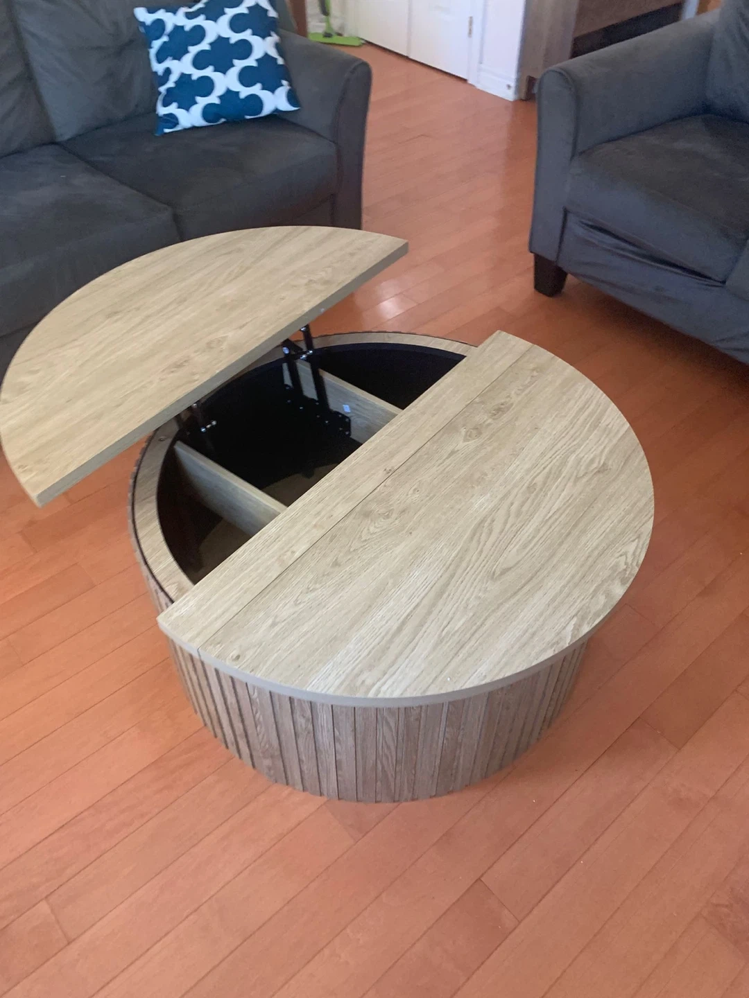 Selling a round lift-top coffee table! It's perfect for adding a touch of style and functionality to your living room. The lift-top design provides a convenient surface for working or dining, while the storage compartment underneath helps keep your space organized