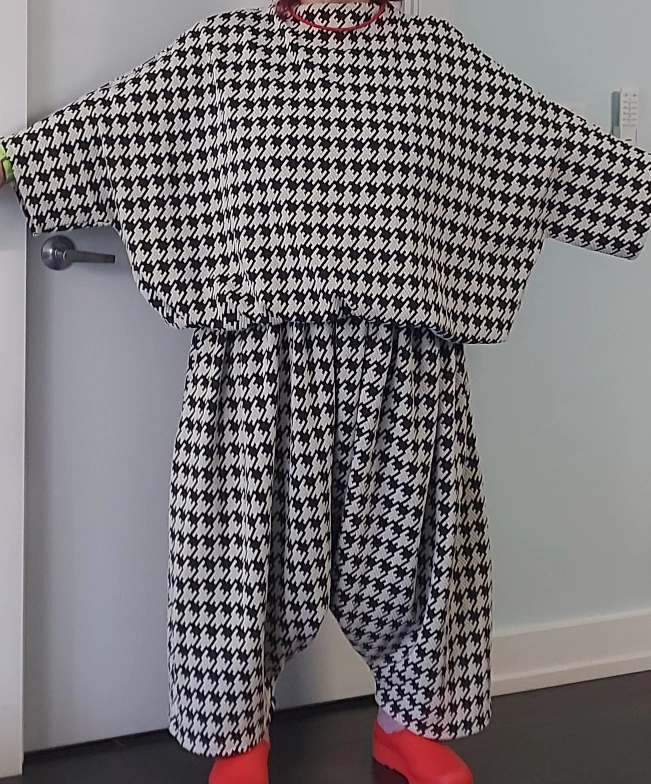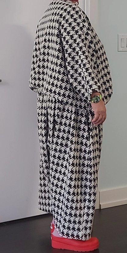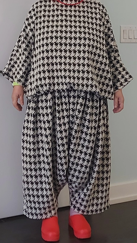 Selling a fall stylish two-piece set featuring a classic houndstooth pattern! The set includes a top and pants with pockets, perfect for a unique and fashionable look. The material feels comfortable and the design is eye-catching, great for making a statement.