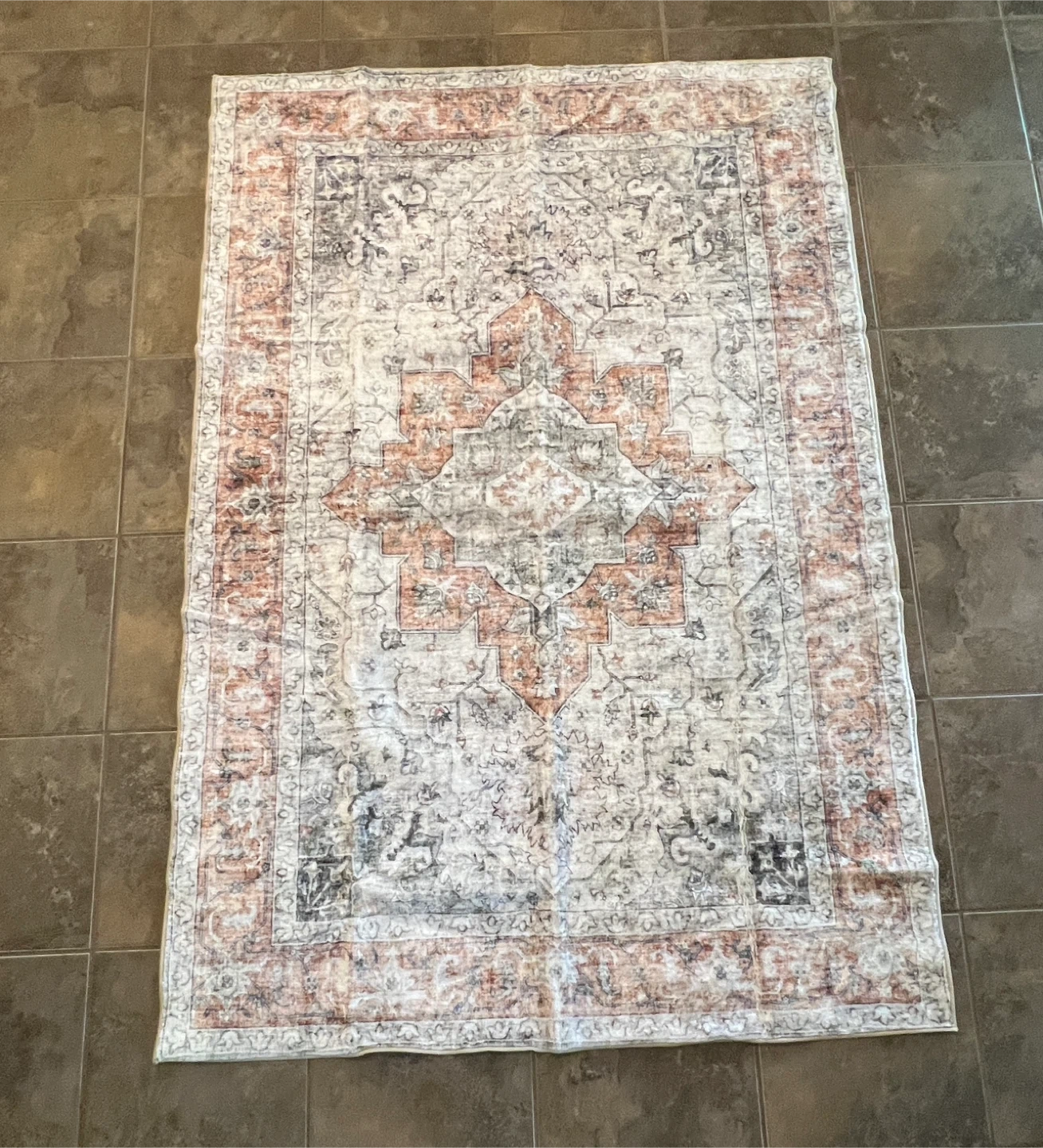 Area rug with a light grey and coral pattern. It's brand new and would look lovely in any room!