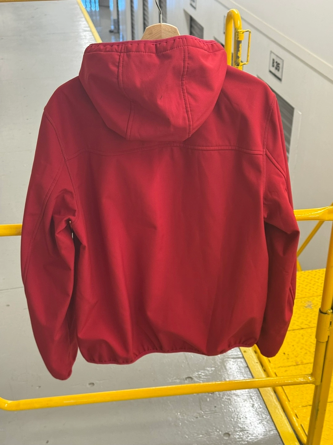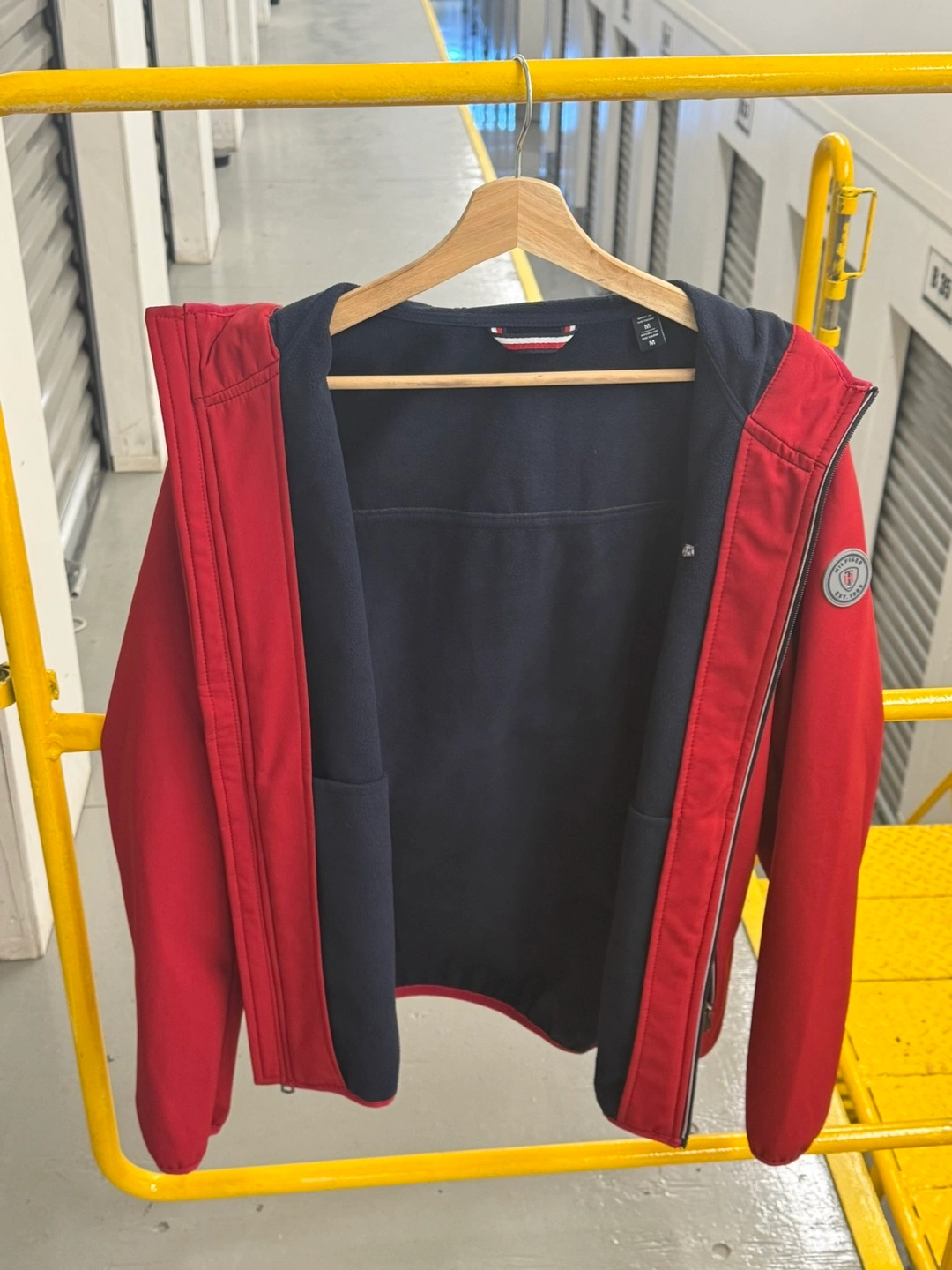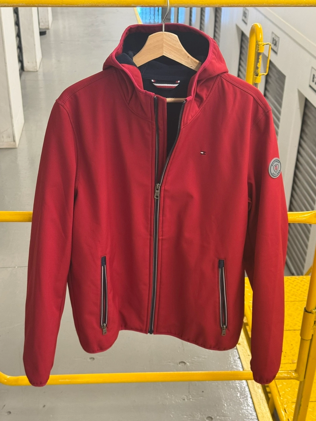 Here's a Tommy Hilfiger softshell jacket in a vibrant red! Never worn - in storage. It's in great condition and ready for a new home. Perfect for those cooler days when you need something lightweight but warm. It has a hood and a comfortable fit, making it ideal for everyday wear.
