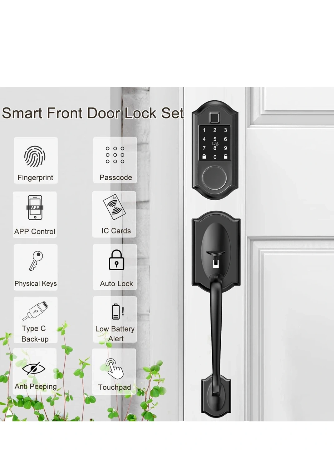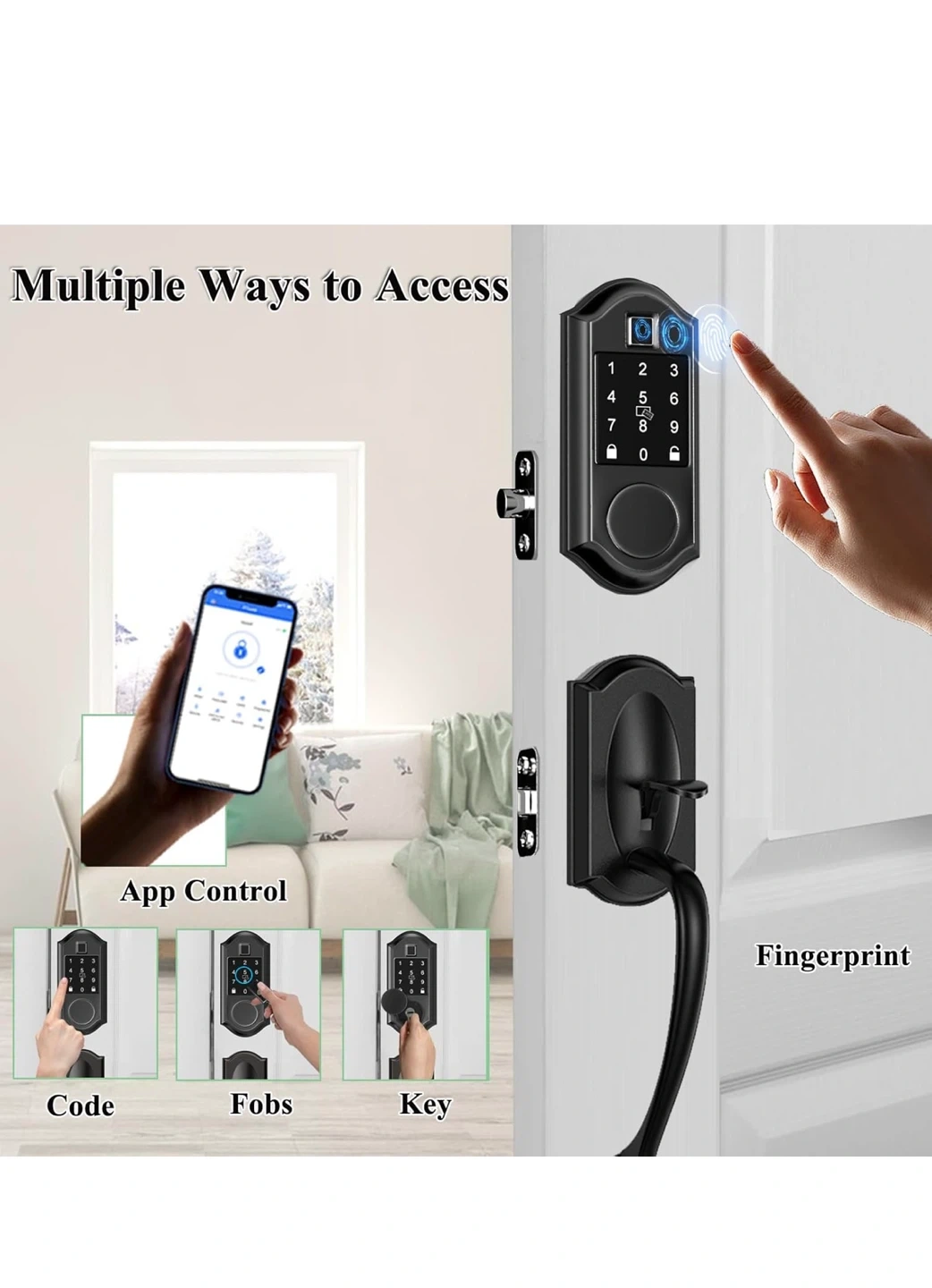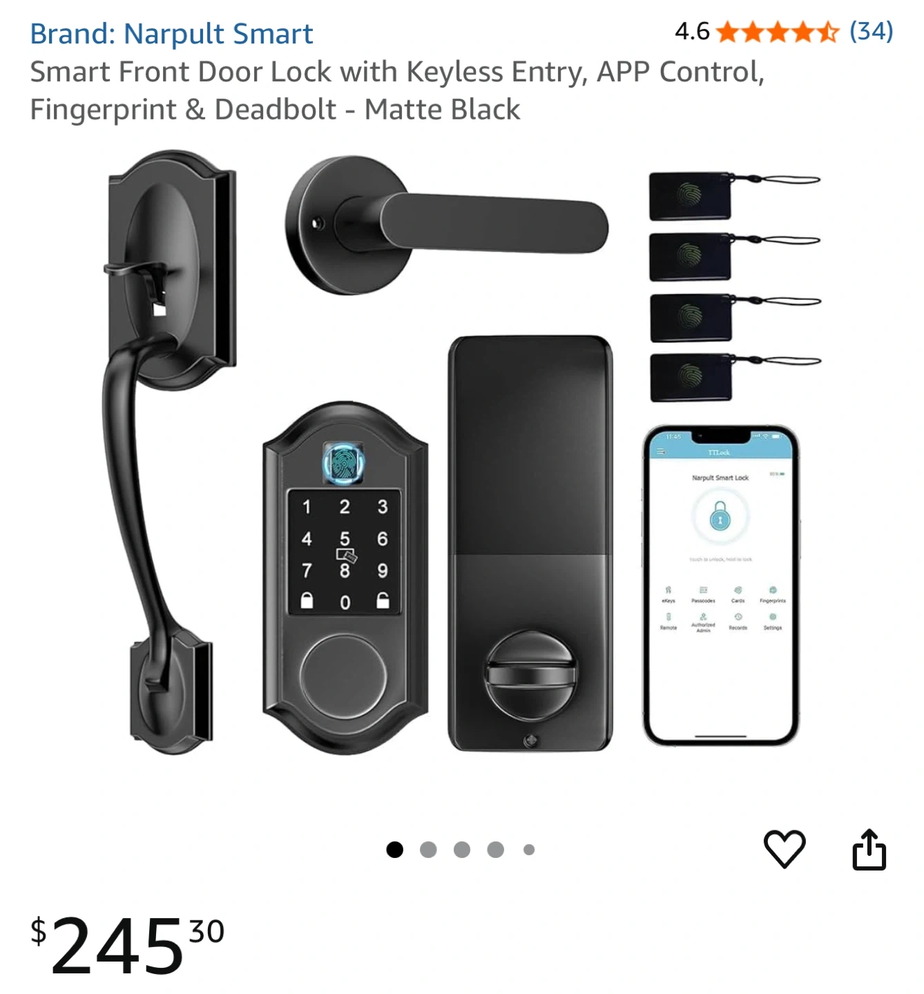 Selling a Narpult Smart Front Door Lock with keyless entry. It features APP control, fingerprint access, and a deadbolt in matte black. It has multiple ways to access including code, fobs, and physical keys. It also has app control, IC cards, physical keys, and auto lock.