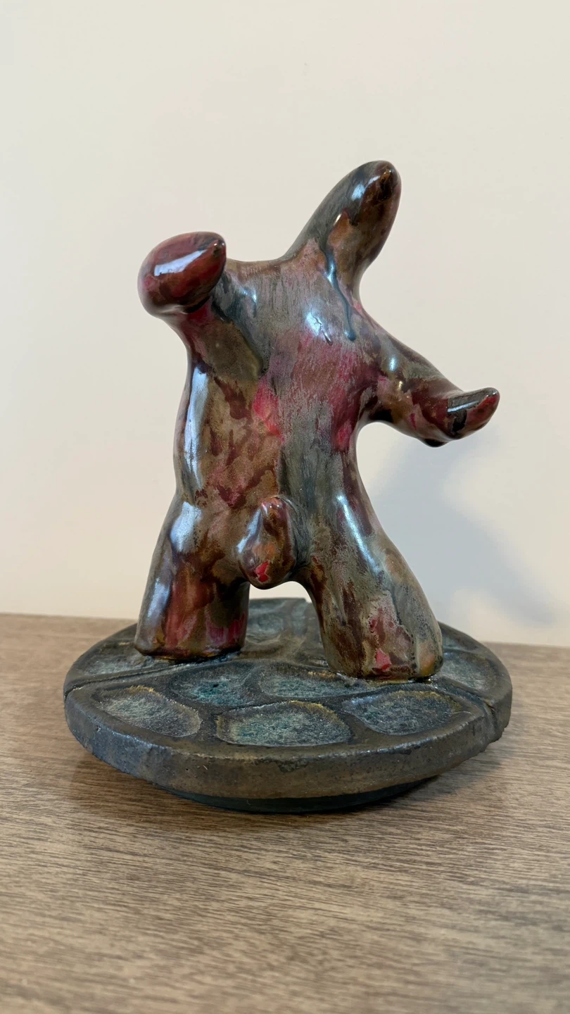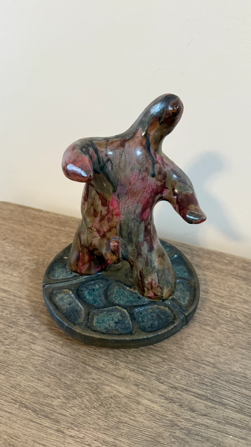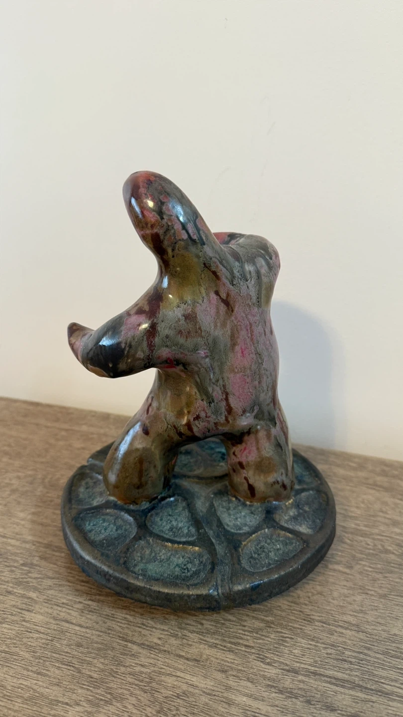 This is a unique ceramic sculpture or a polar bear with a glossy finish and interesting colour patterns. It would make a great addition to any home decor!