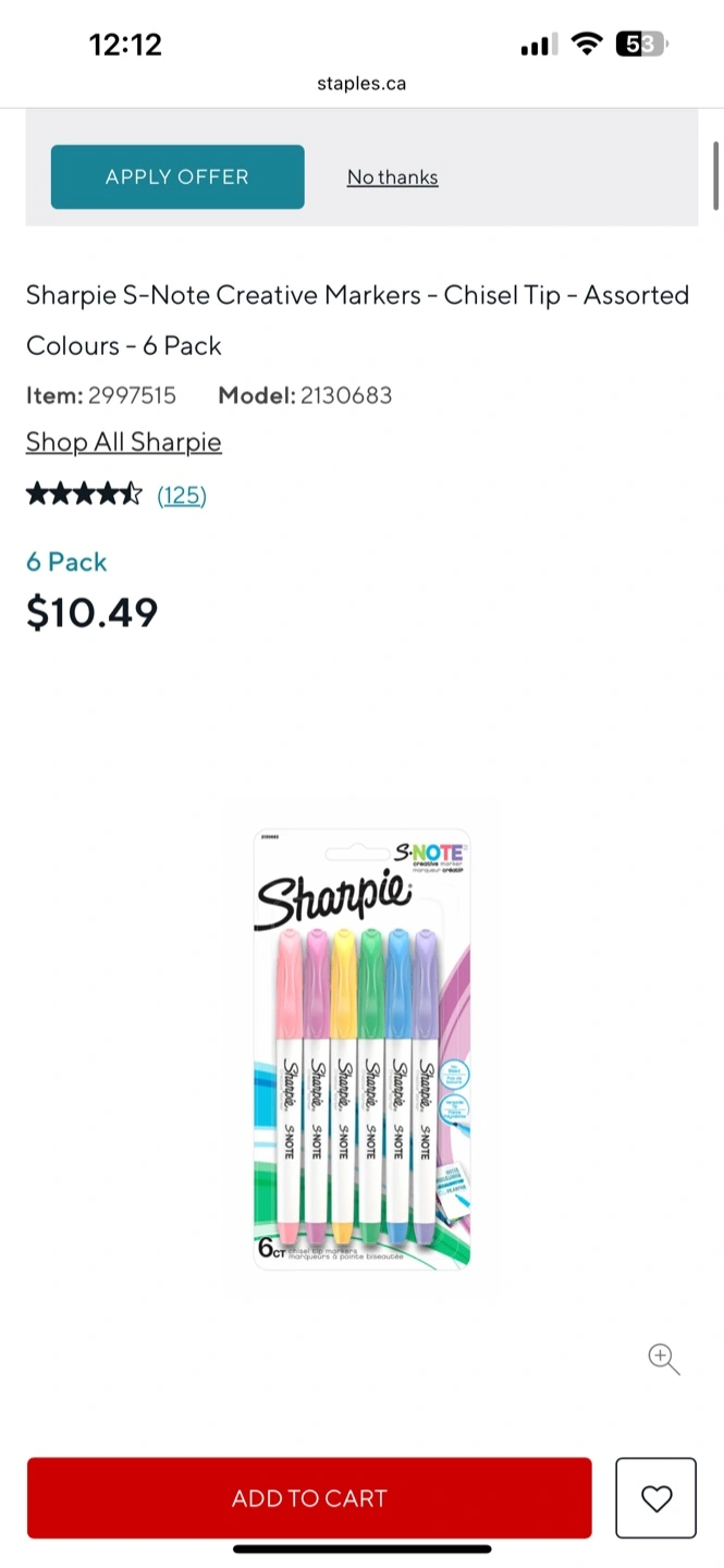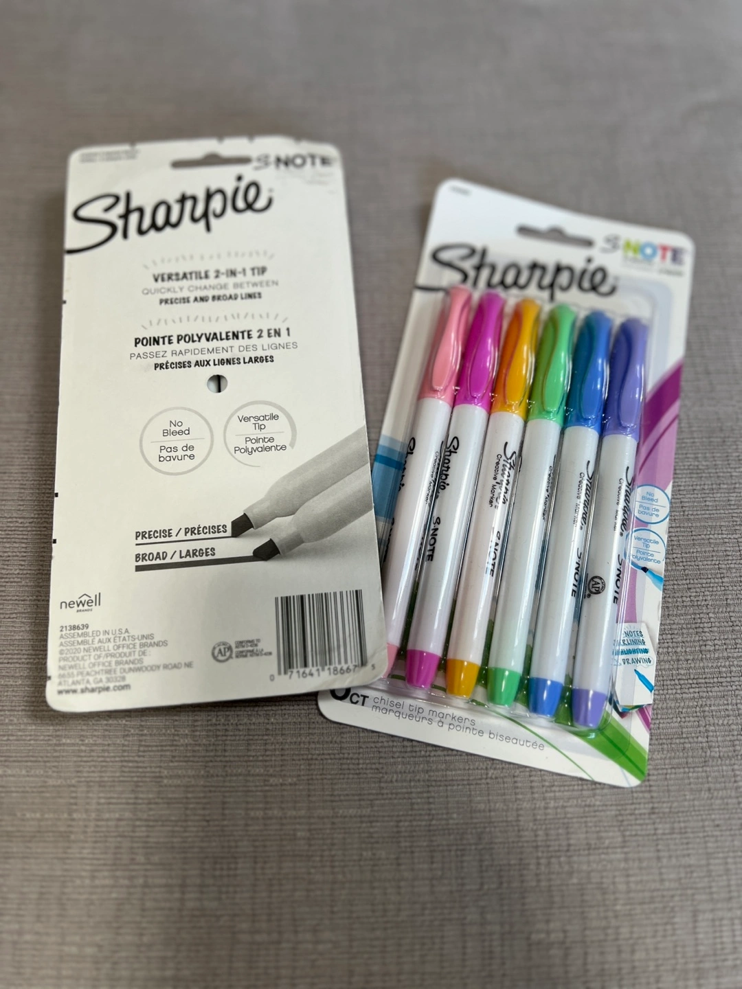 I'm selling two packs of Sharpie S-Note Creative Markers. Each pack contains 6 chisel tip markers in assorted colours. These markers are versatile 2-in-1 tip, providing both precise and broad lines. Originally bought for $10.49 per pack.