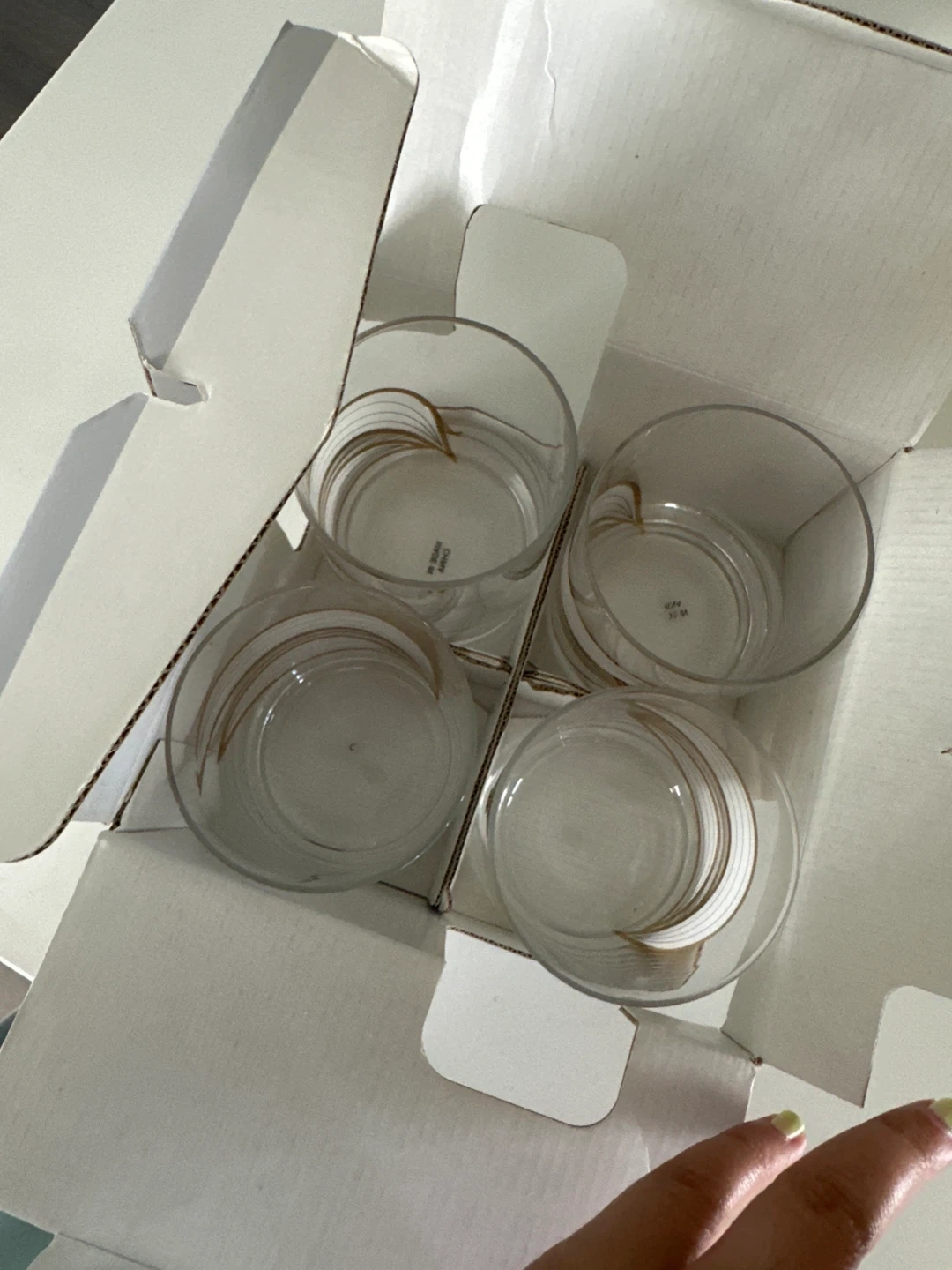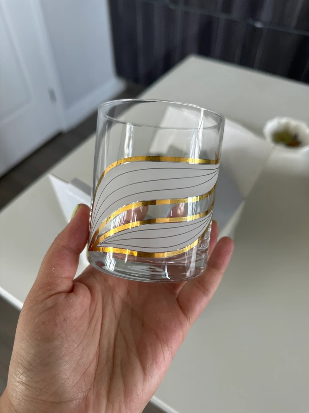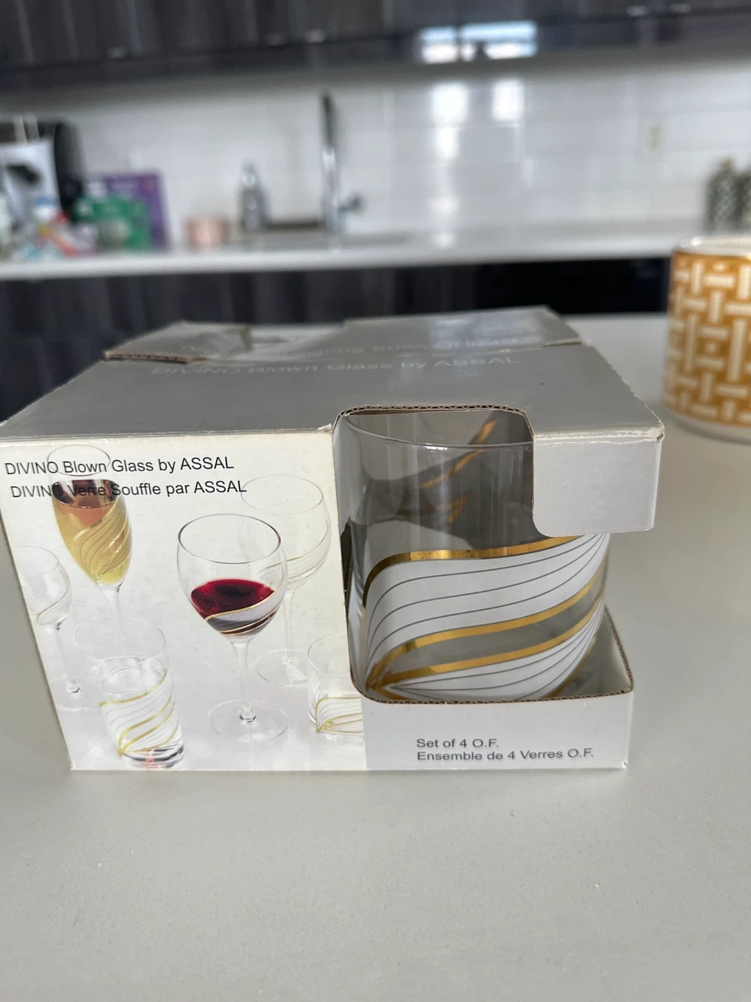 Selling a set of 4 Assal Divino blown glass O.F. glasses. They feature a lovely gold and white wave design. The original box is included!