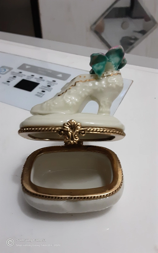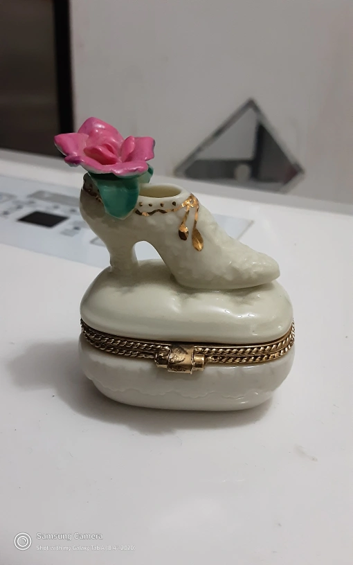 A charming porcelain shoe trinket box, perfect for storing small treasures! The design features a delicate rose accent and gold trim, adding a touch of elegance to any space