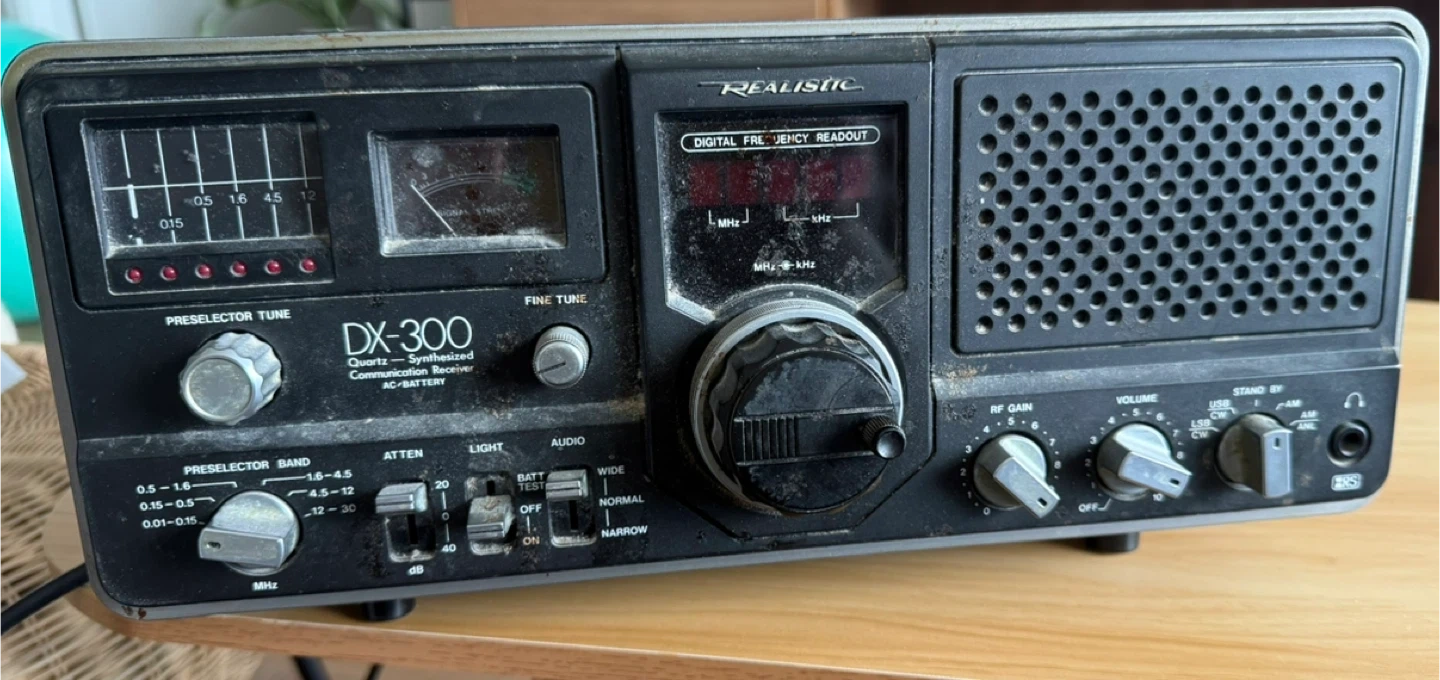 Selling a Realistic DX-300 Quartz Synthesized Communication Receiver. It's an AC/Battery powered device with a digital frequency readout. Features include a preselector tune and band, attenuation, light, and audio controls. There are also knobs for RF gain and volume.