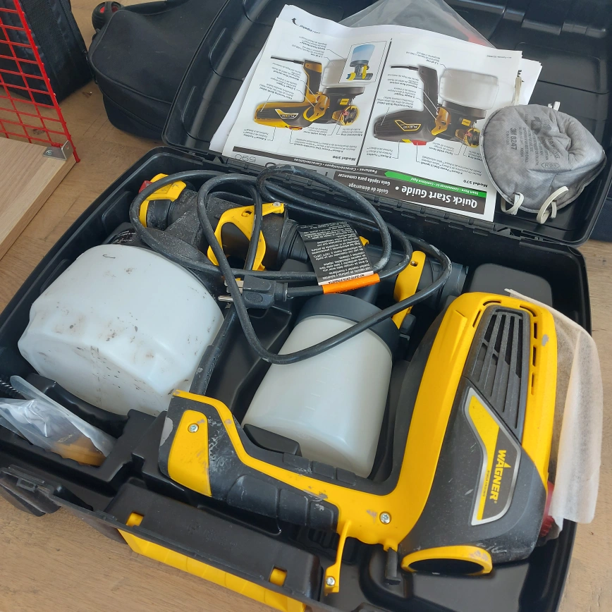 Selling a Wagner Flexio 590 paint sprayer. It comes with the original box and components, including the owner's manual and quick start guide. It's a great tool for bigger paint jobs. Only used once to paint a 1 car garage exterior. In near New condition.