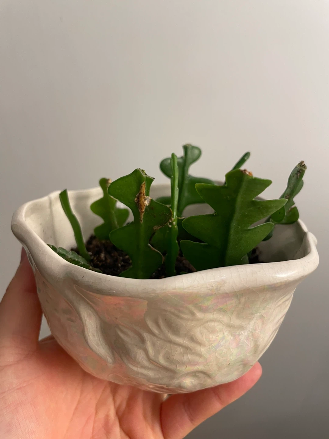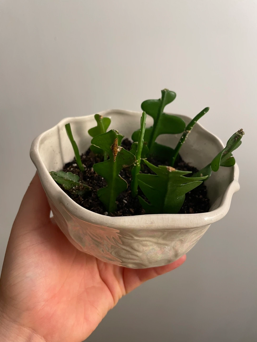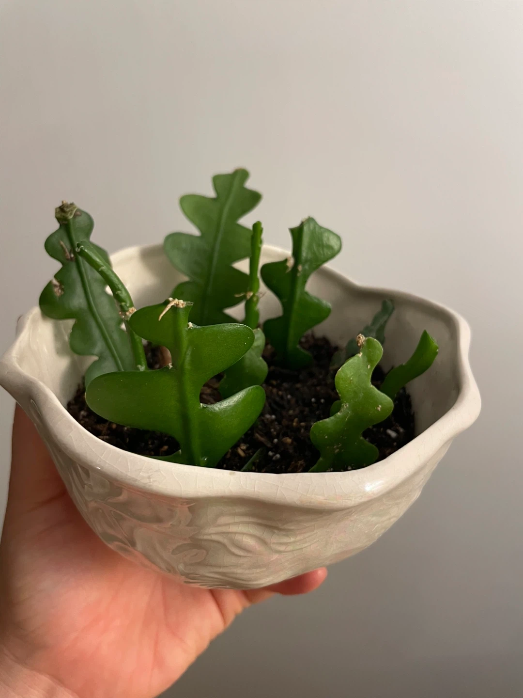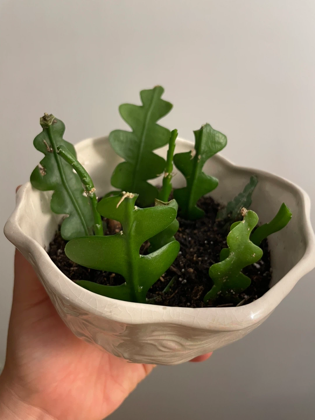 I'm selling a healthy Epiphyllum Anguliger, also known as a Fishbone Cactus! It's currently potted in a lovely ceramic pot. This unique plant is known for its zig-zag shaped leaves, resembling a fishbone. It's easy to care for and adds a touch of greenery to any space