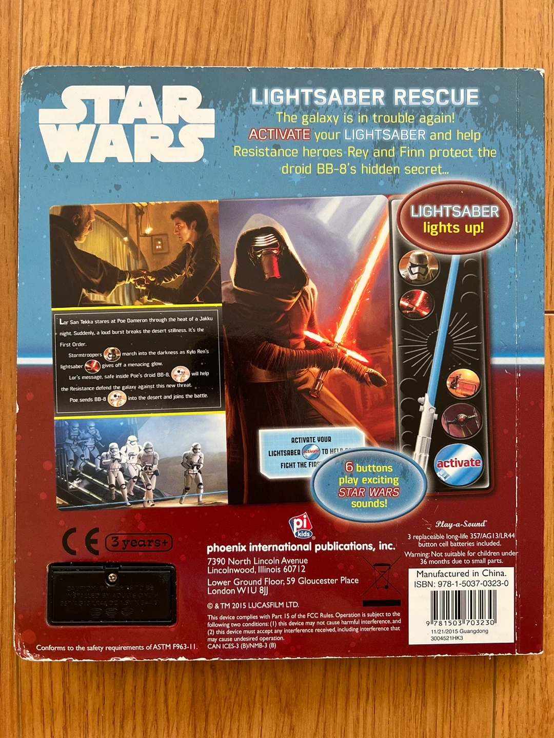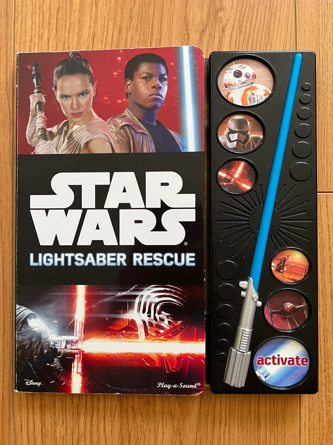 Selling a Star Wars Lightsaber Rescue Play-a-Sound book! It includes 6 buttons that play exciting Star Wars sounds. It also includes a lightsaber that lights up. Recommended for ages 3 years and up. Requires 3 long-life 357/AG13/LR44 button cell batteries (included) Pickup in Richmond.