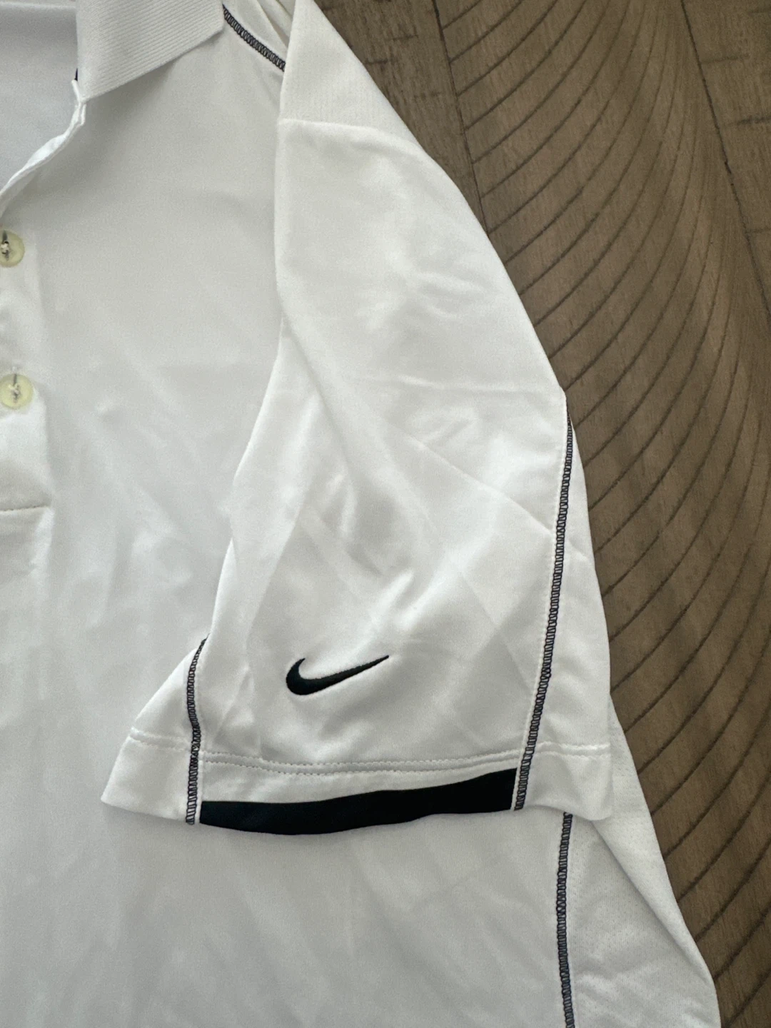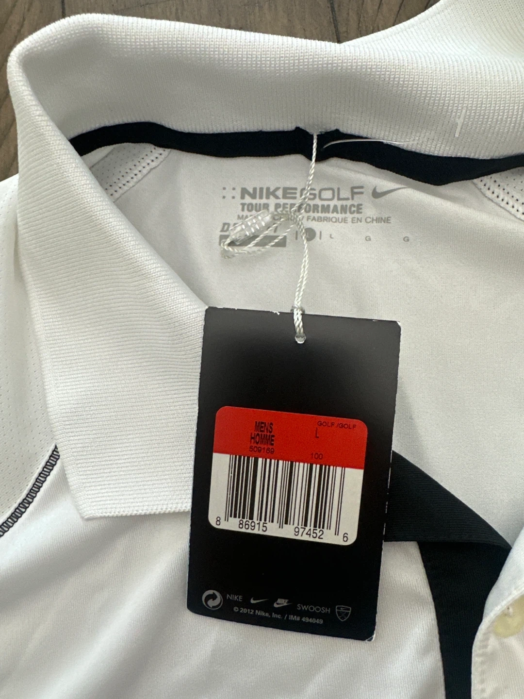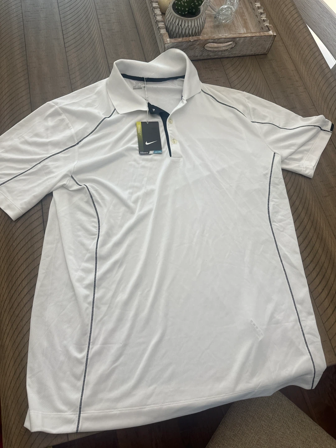 I'm selling a new Nike Golf Tour Performance polo shirt. It's white and a size large. This polo is perfect for hitting the links in style and comfort!