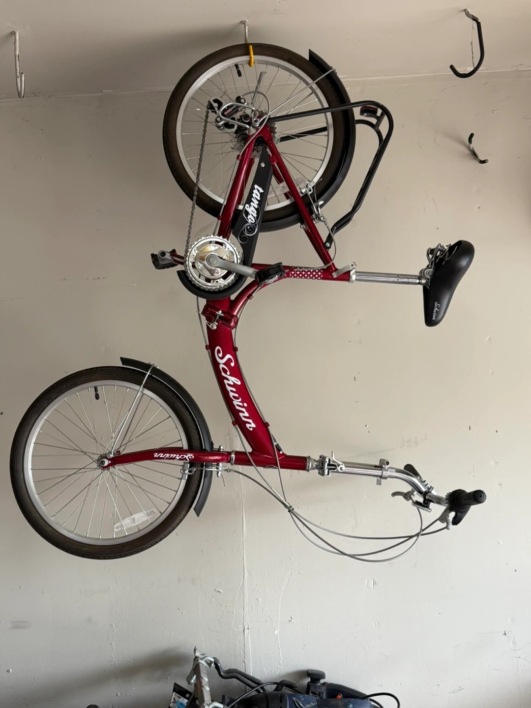 Selling a Schwinn Tango folding bike! It's a vibrant red and perfect for easy storage and transport. Great for city commuting or weekend rides