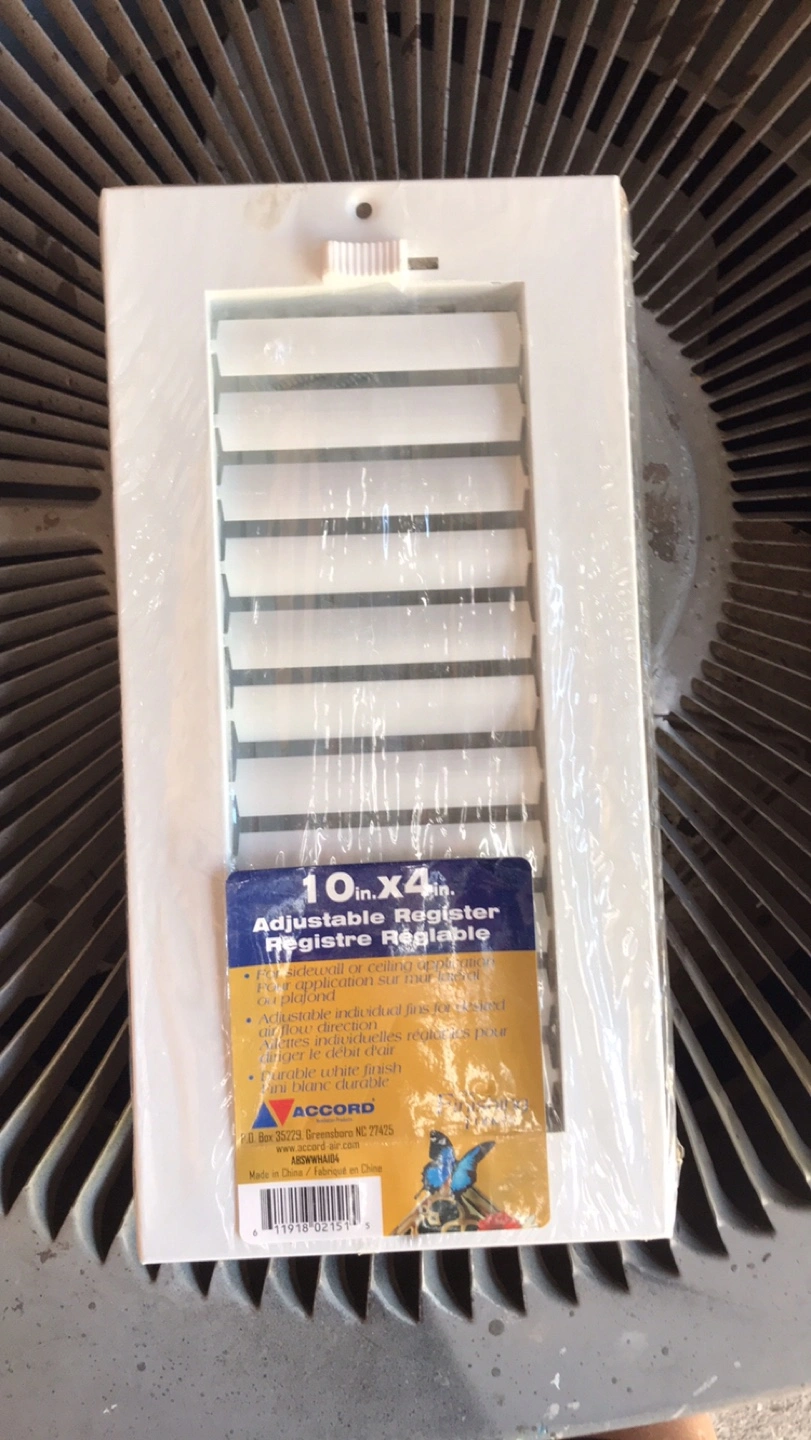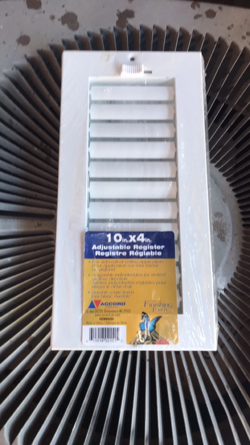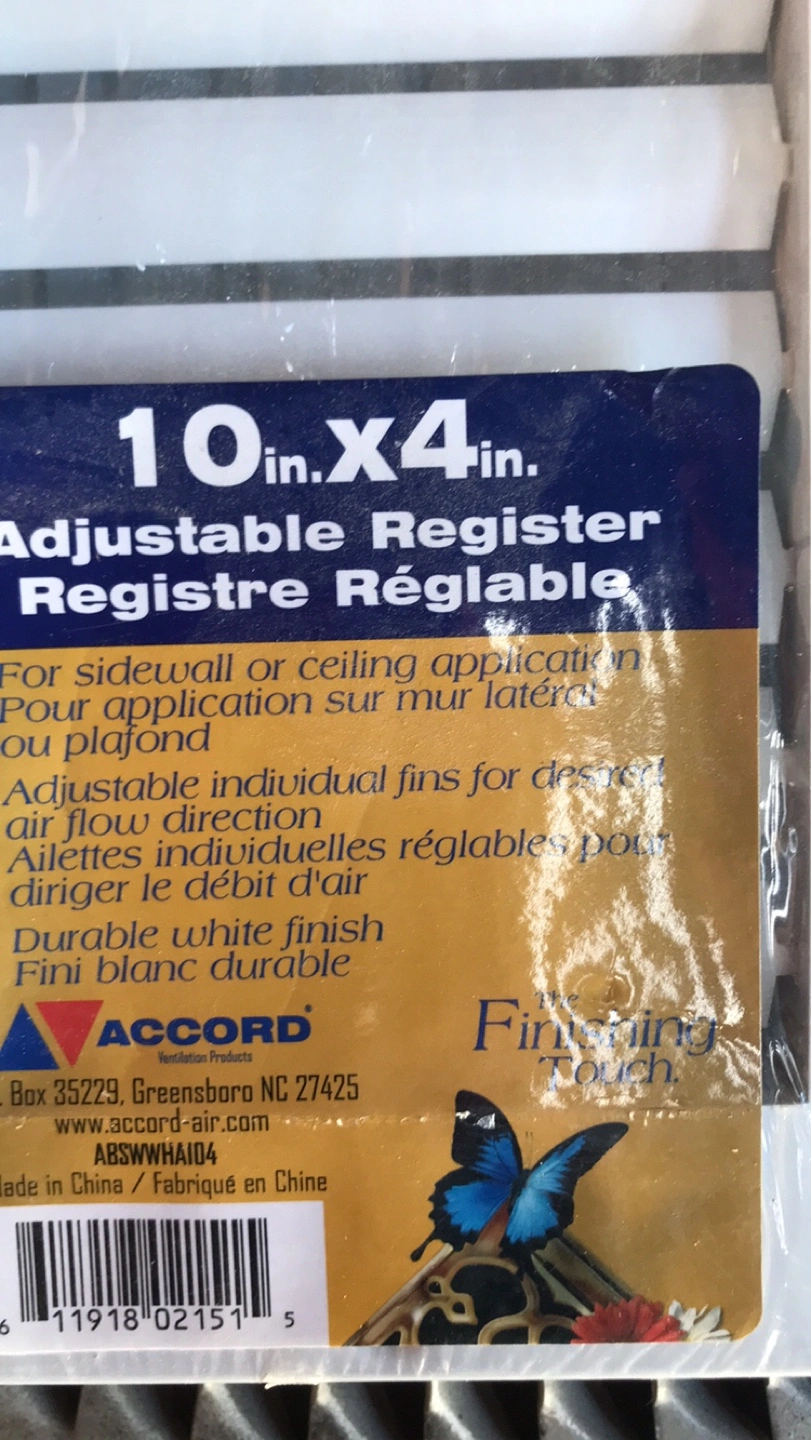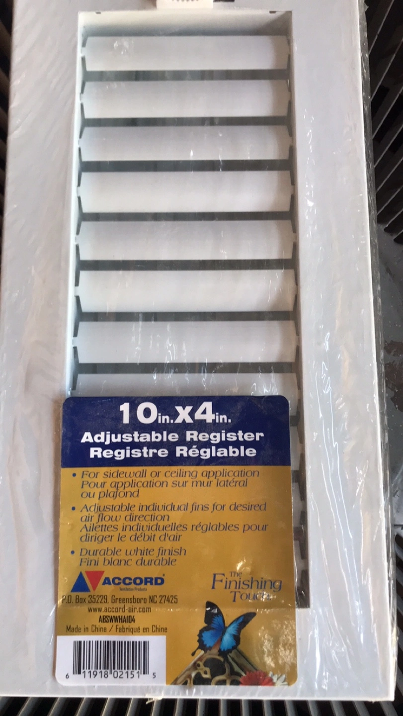 Selling a brand new Accord Adjustable Register! It's 10 inches by 4 inches and perfect for sidewall or ceiling application. It has adjustable individual fins for desired air flow direction and a durable white finish. Pick up location is 10 Alcorn Avenue M4V1E4