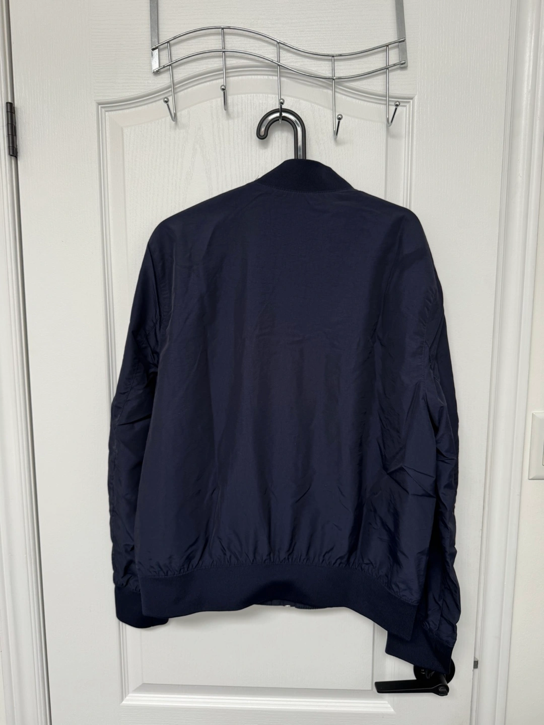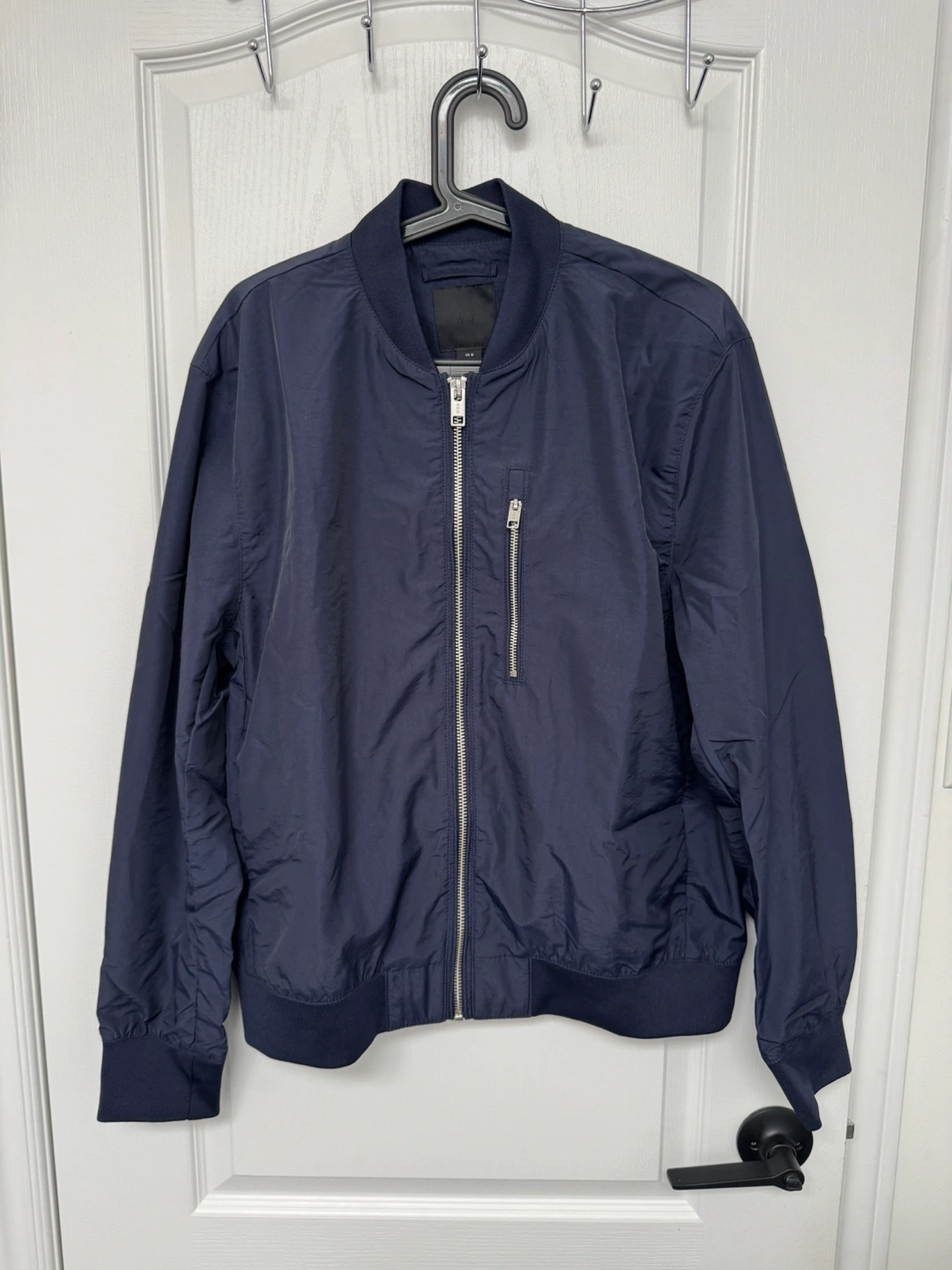 Here's a stylish navy blue bomber jacket! It's in great shape and ready for a new home. Perfect for layering or wearing on its own during those cooler days. It has a classic bomber style with a full zip and a sleek look that goes with just about anything