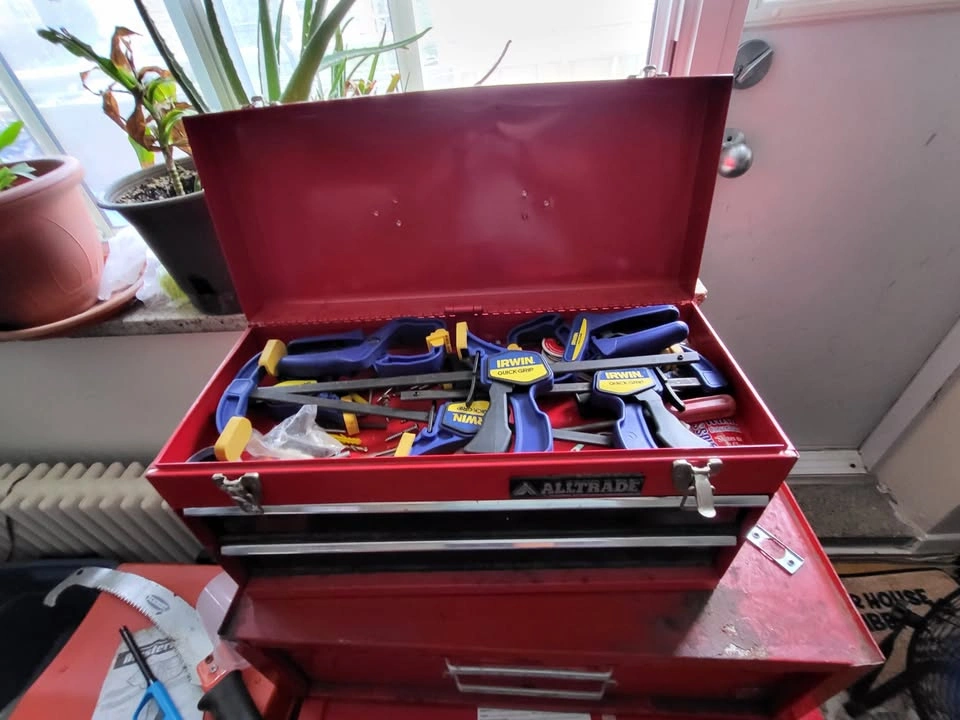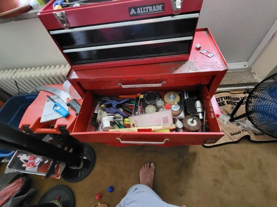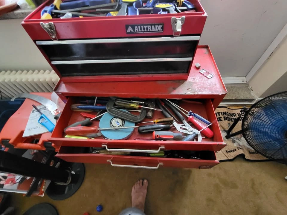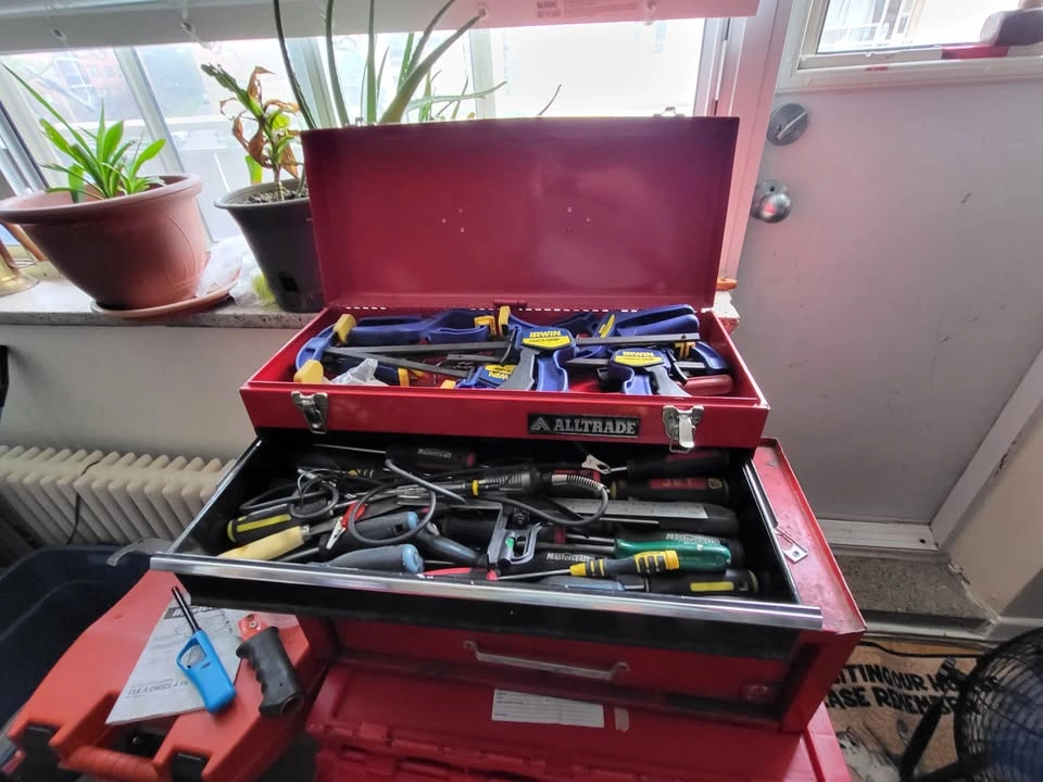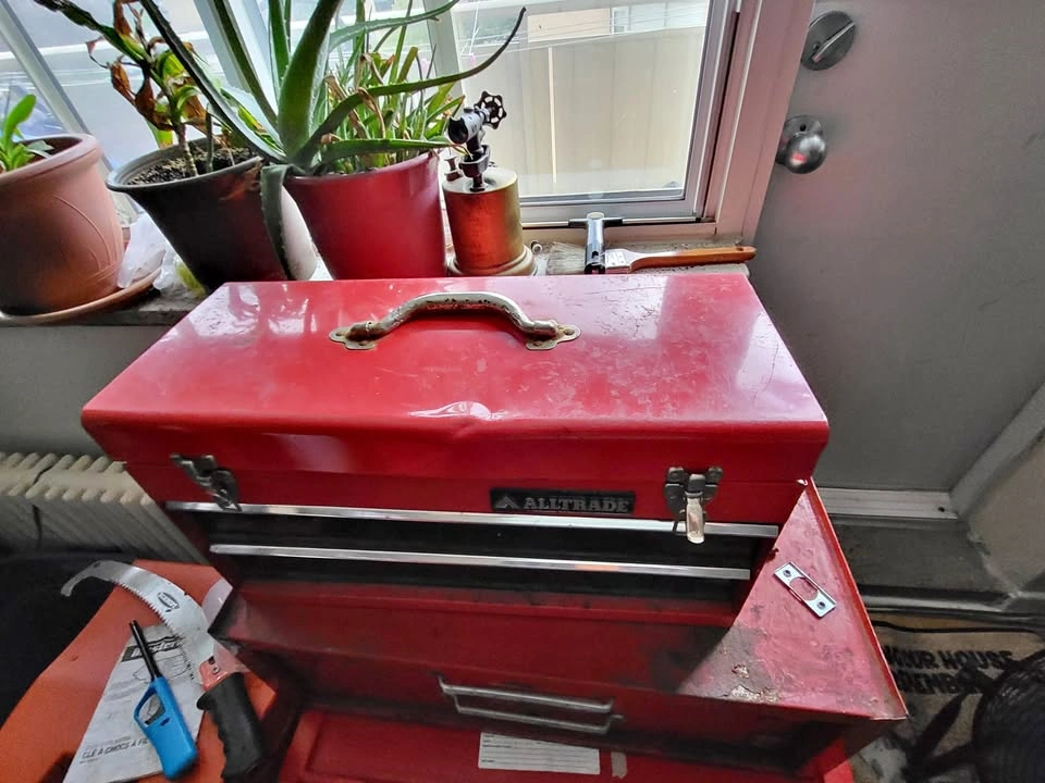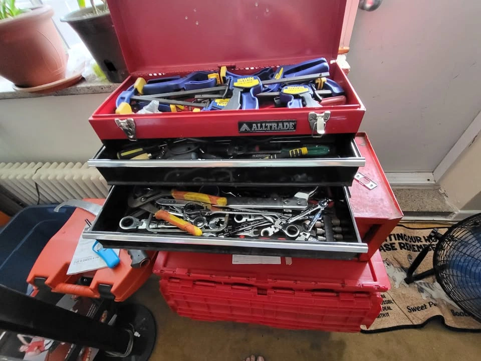 Assorted tools, some are new, some are used metal toolboxes with 2 drawers each.