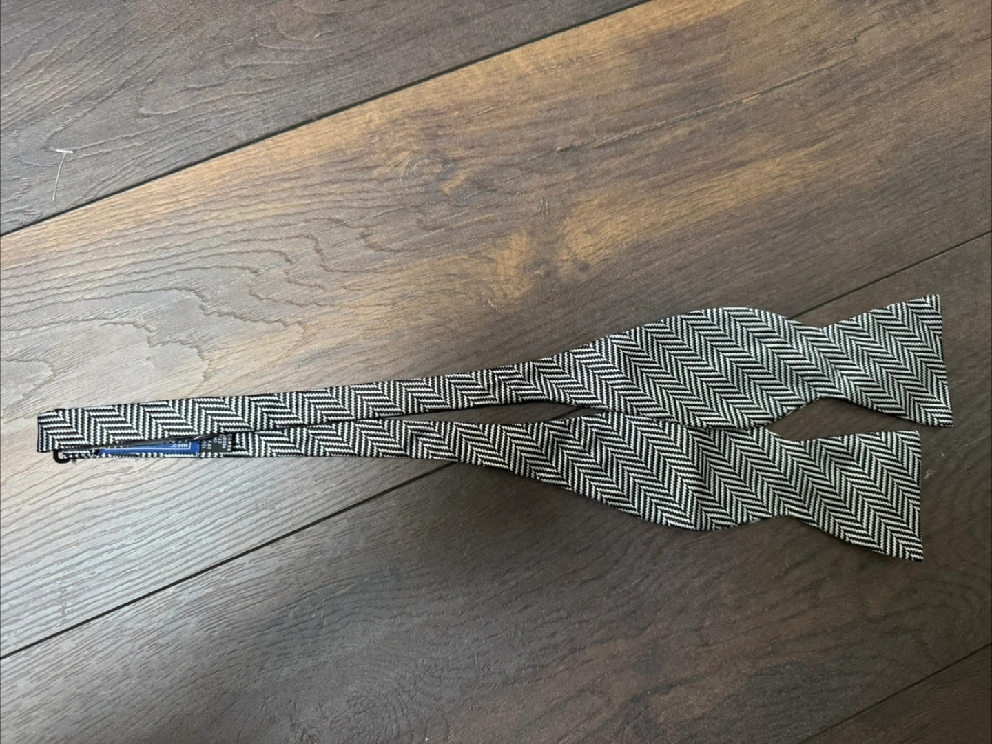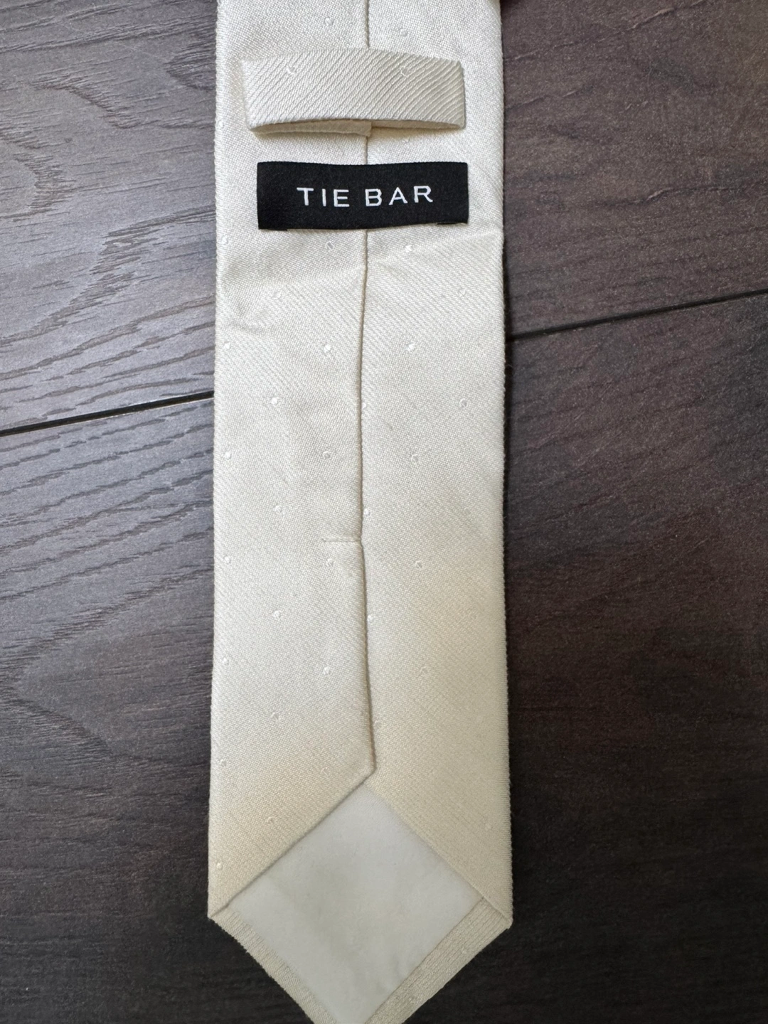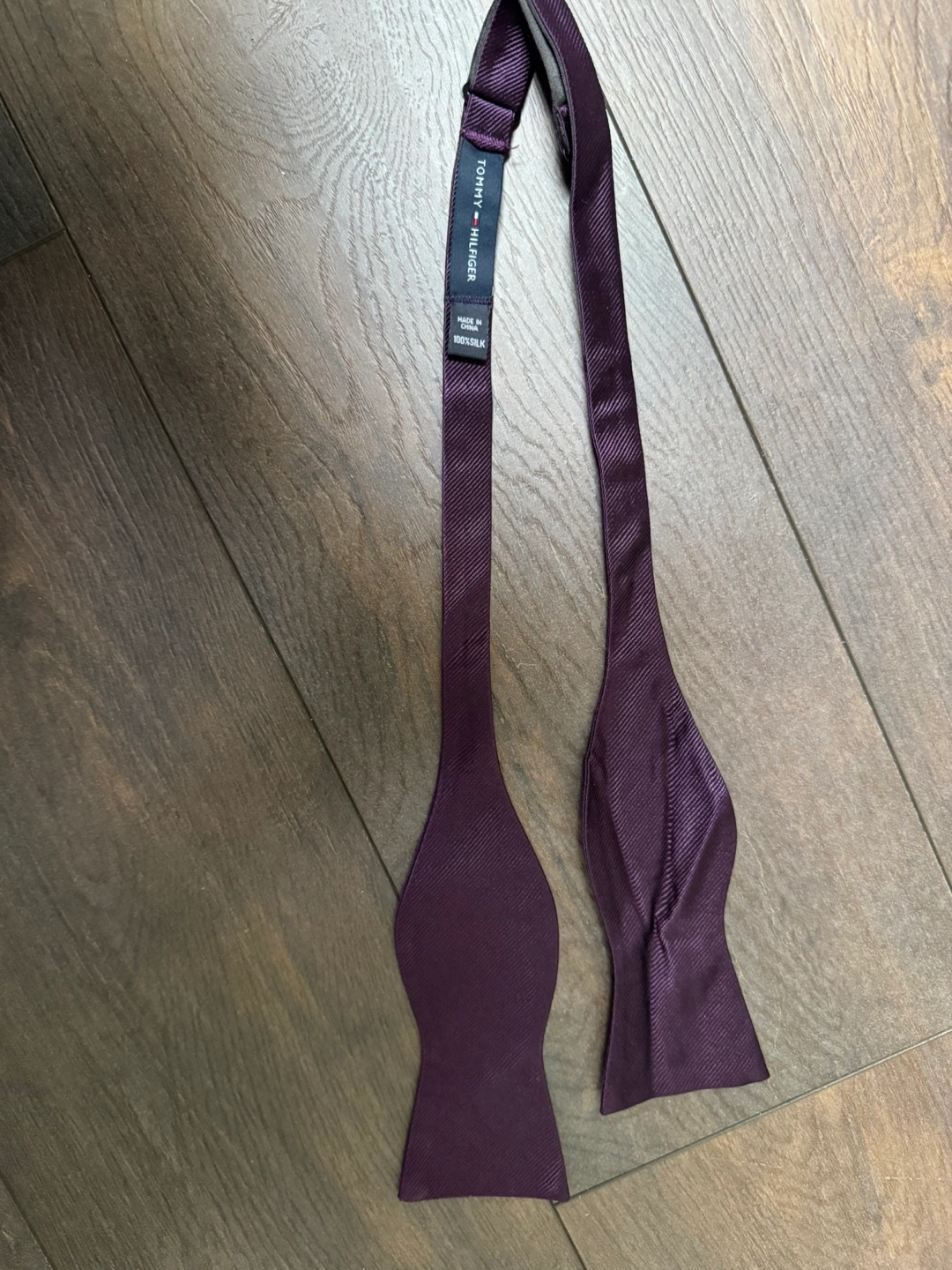 1 standard slim fit men’s tie in cream w polka dots, tie bar brand 1 herringbone pattern silver and black bow tie, tie bar brand 1 Tommy Hilfiger bow tie in purple $5 each or all 3 for $12