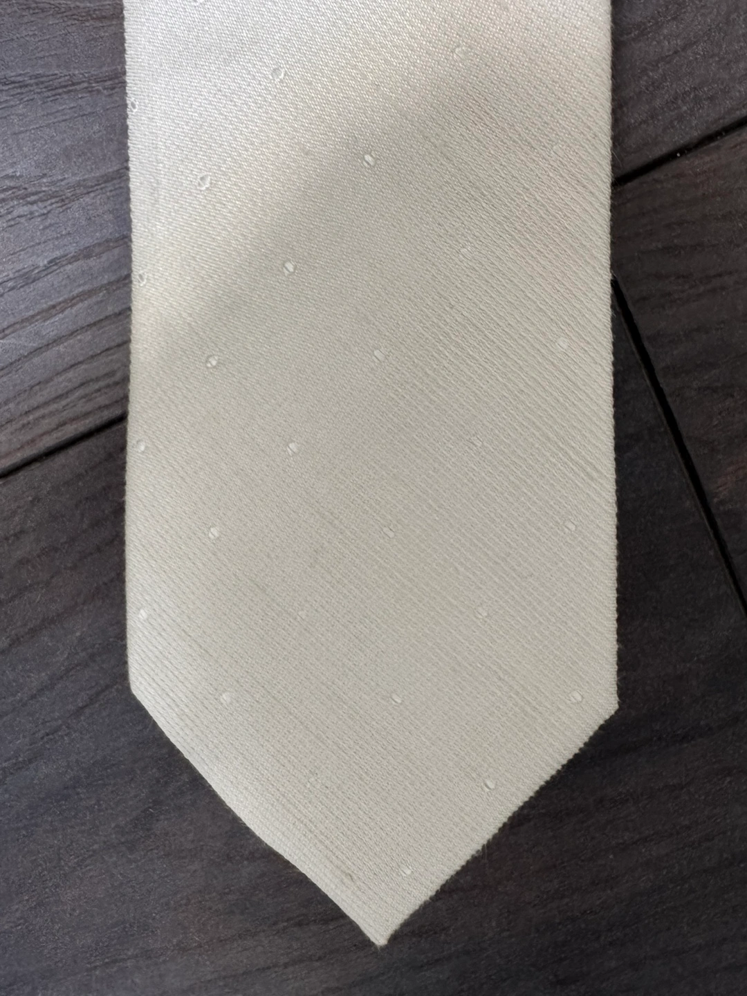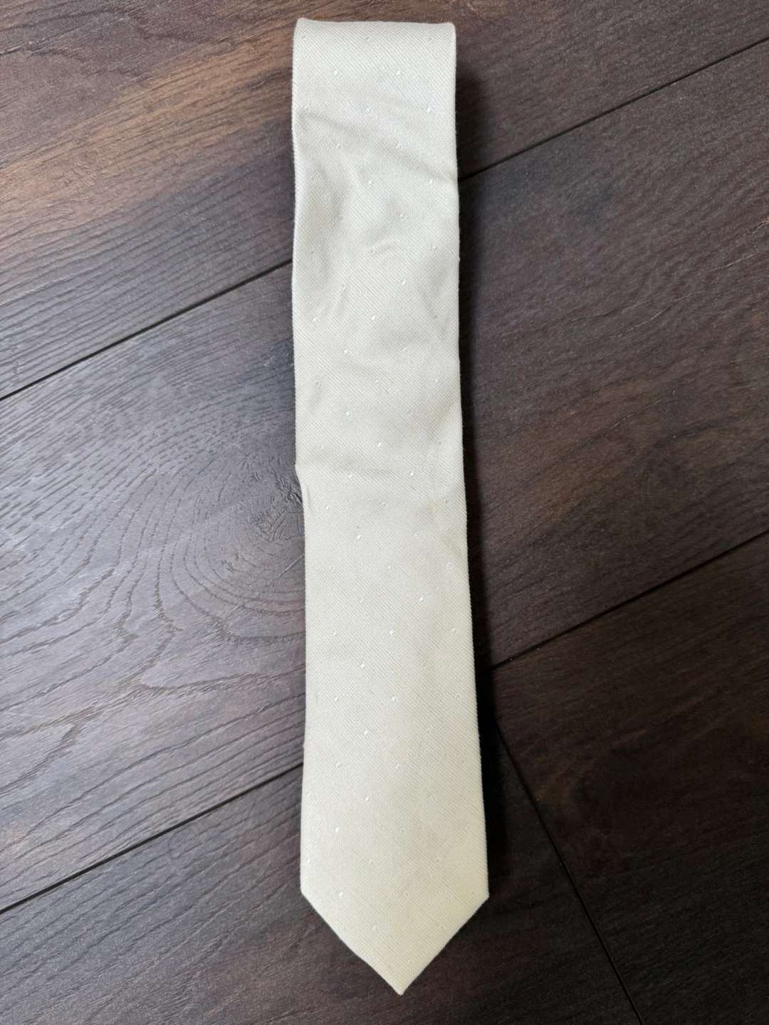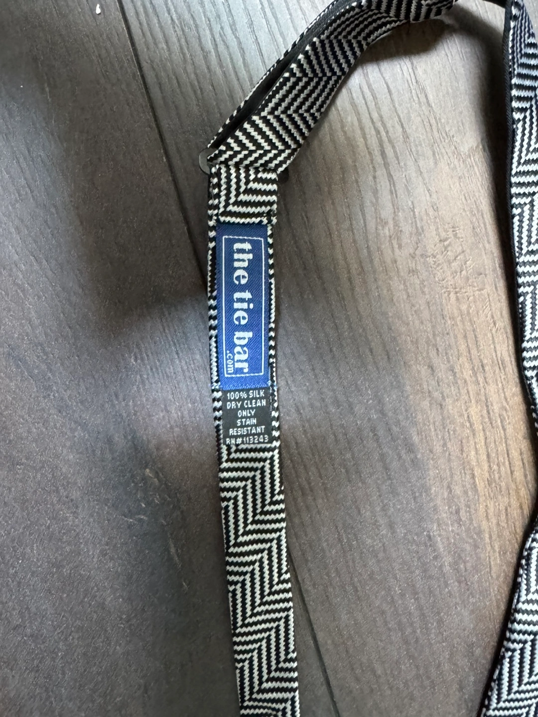 1 standard slim fit men’s tie in cream w polka dots, tie bar brand 1 herringbone pattern silver and black bow tie, tie bar brand 1 Tommy Hilfiger bow tie in purple $5 each or all 3 for $12