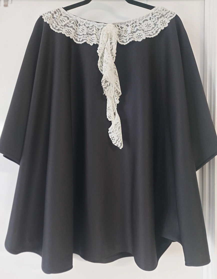 Selling a stylish black poncho featuring a delicate lace collar! It's new and would be a lovely addition to any wardrobe