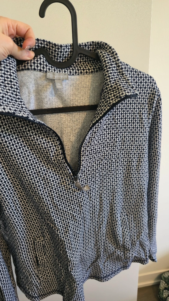 Selling a Talbots quarter-zip pullover in a navy and white patterned design. It's a size medium petite (MP) and in great condition! Perfect for layering or wearing on its own.