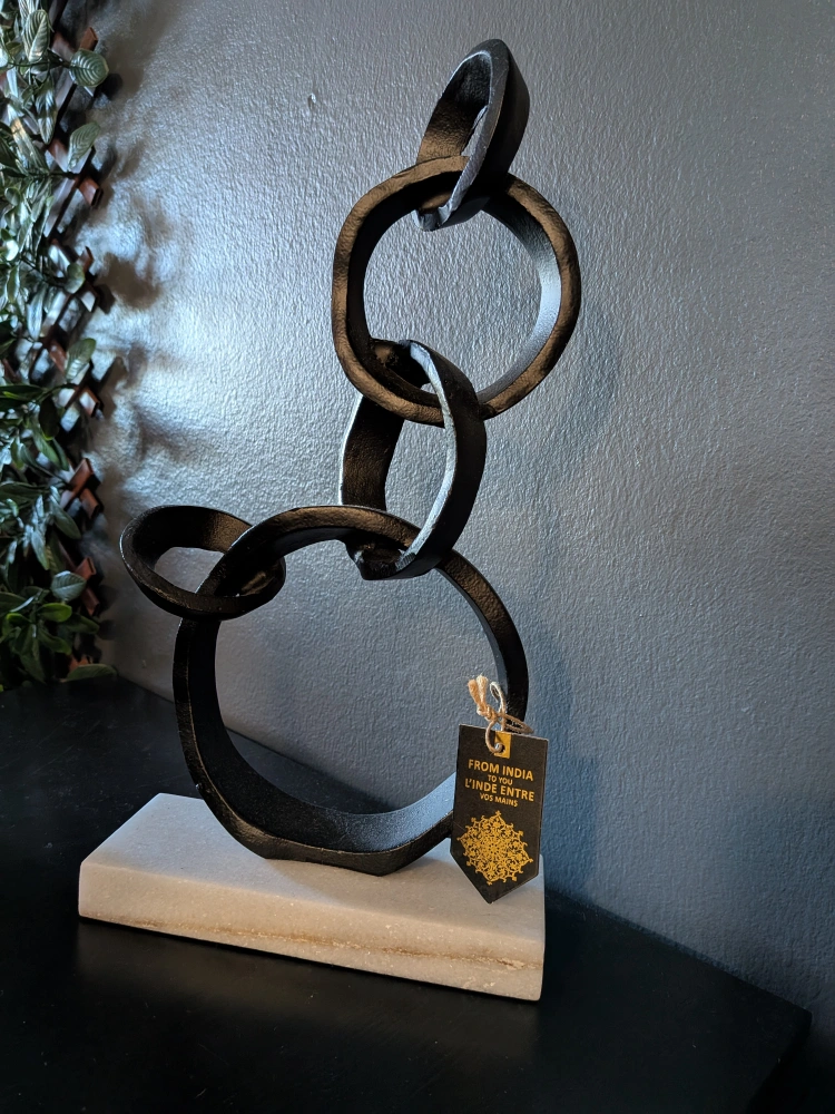 Unique metal chain link sculpture on a marble base. The tag says "From India L'Inde Entre Vos Mains". Adds a touch of modern art to any room!