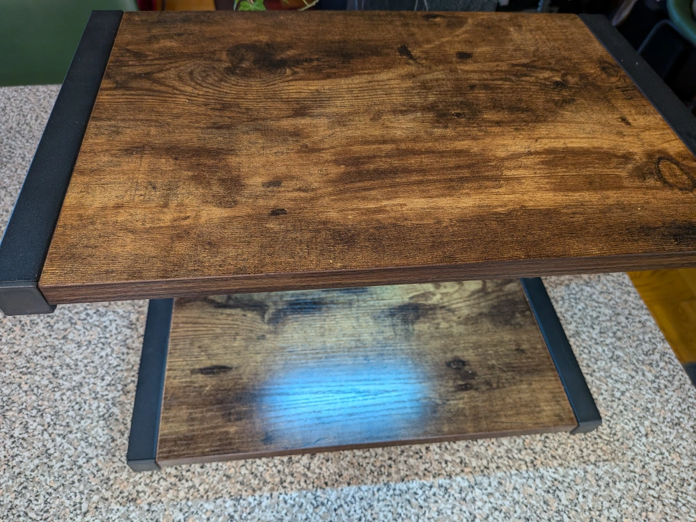 This is a sturdy little plant stand or side table with a rustic wood finish and black metal frame. It's in great shape and would look lovely in any room! Perfect for displaying plants or holding your favourite books and beverages