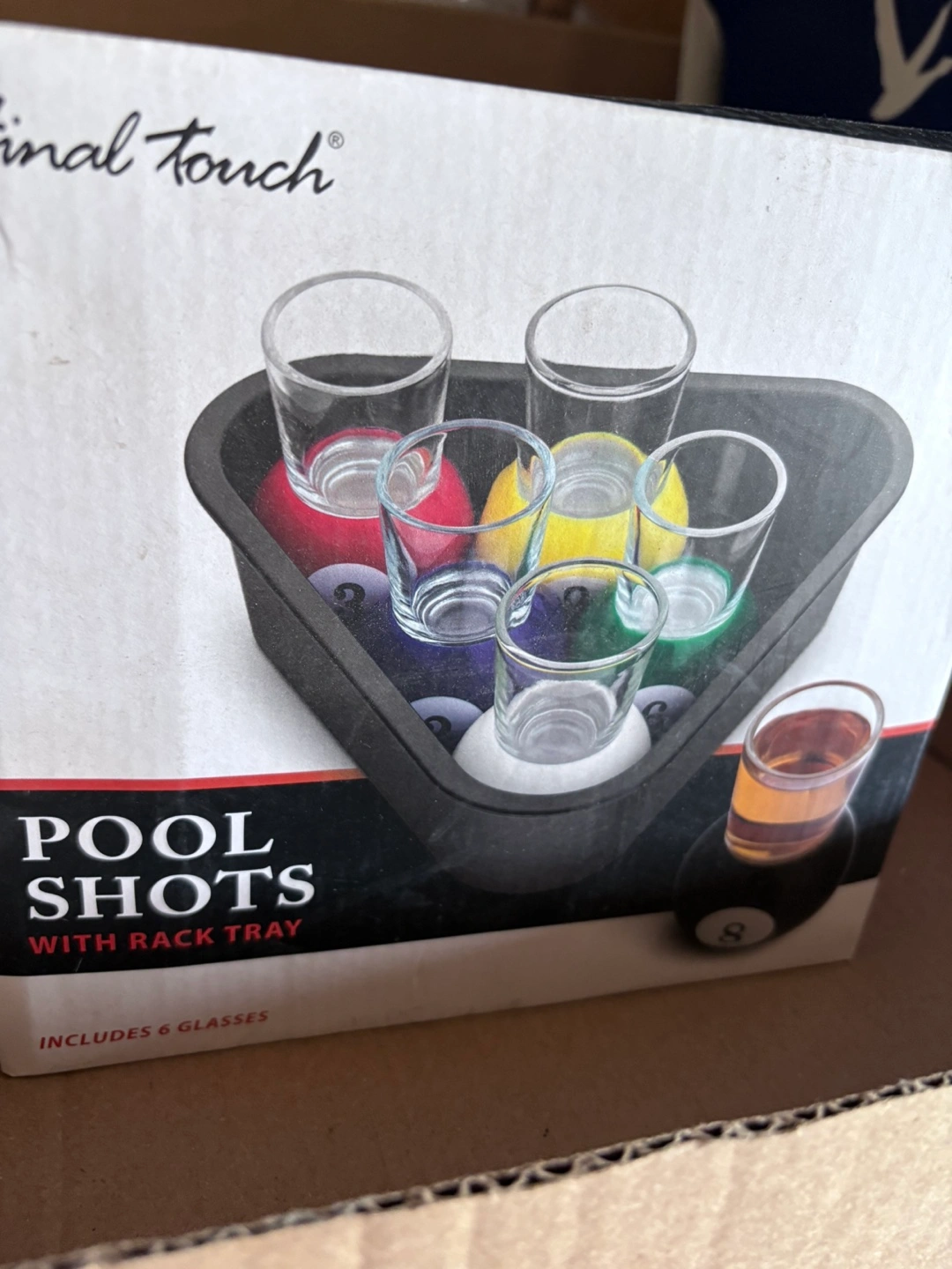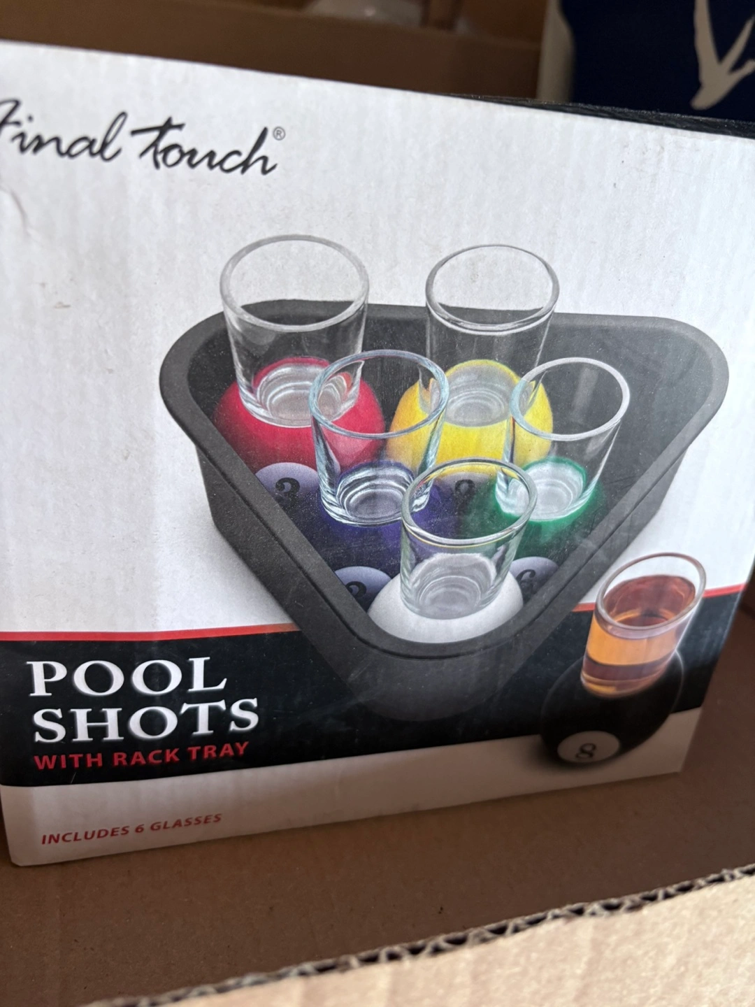 Selling a Final Touch Pool Shots set! It comes with a rack tray and six glasses, perfect for entertaining. The set is in great condition and includes the original box