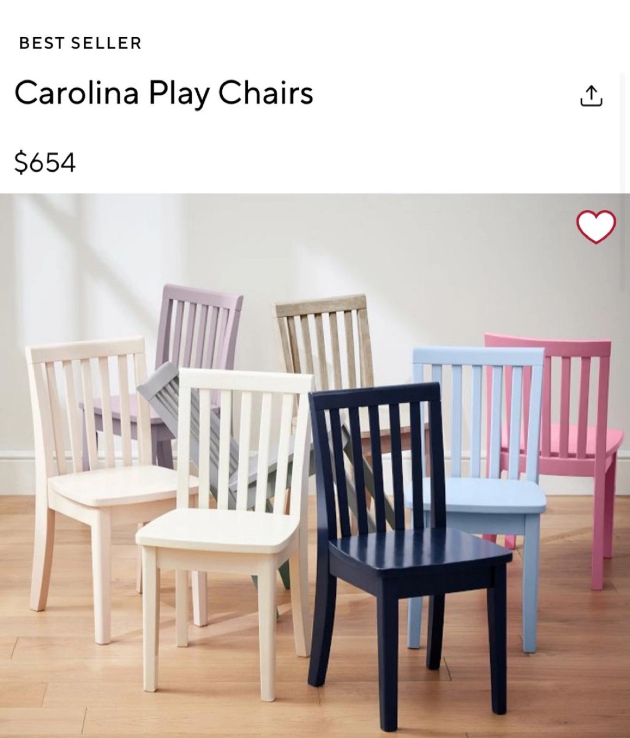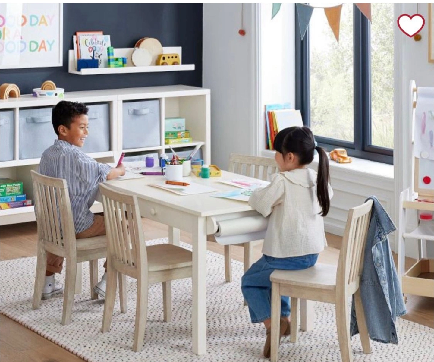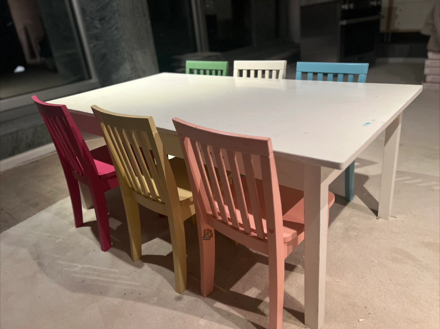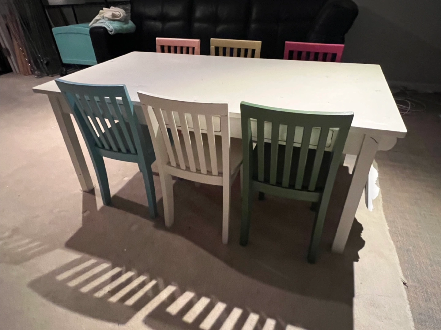 Pottery Barn Kids Large Craft Table Solid Wood With 6 colourful matching wooden chairs
