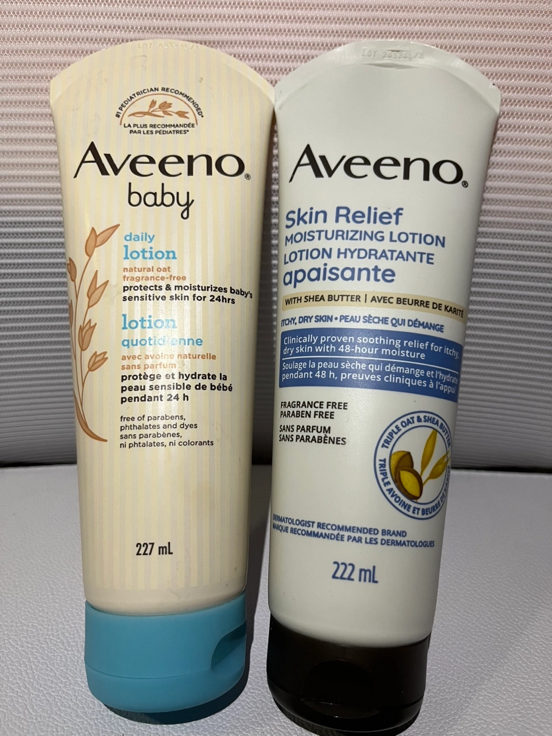 I'm selling two bottles of Aveeno lotion! One is the Aveeno Baby Daily Lotion (227 mL), and the other is Aveeno Skin Relief Moisturizing Lotion (222 mL). Both for $15 Cash only Pick up only