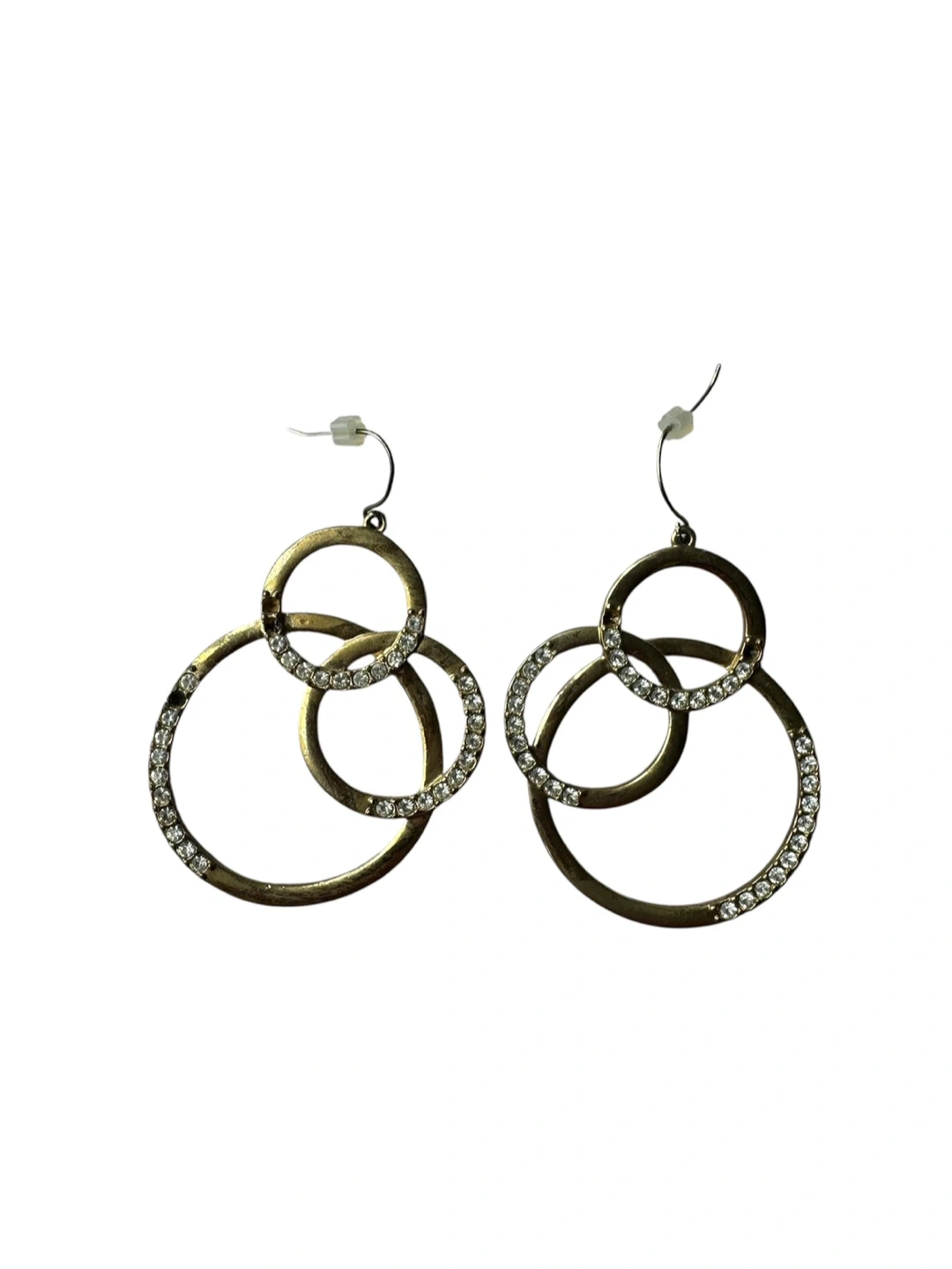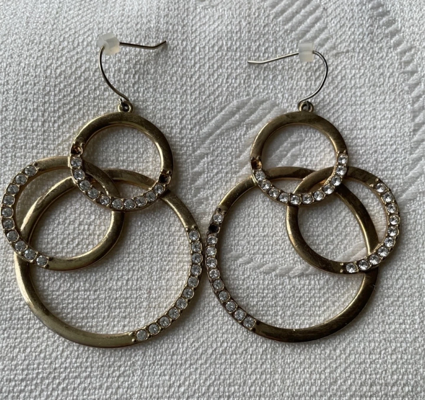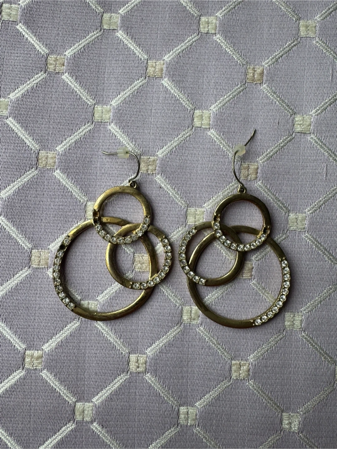 Selling a pair of circle drop earrings. They are gold in colour and have some rhinestones. They are in good condition!