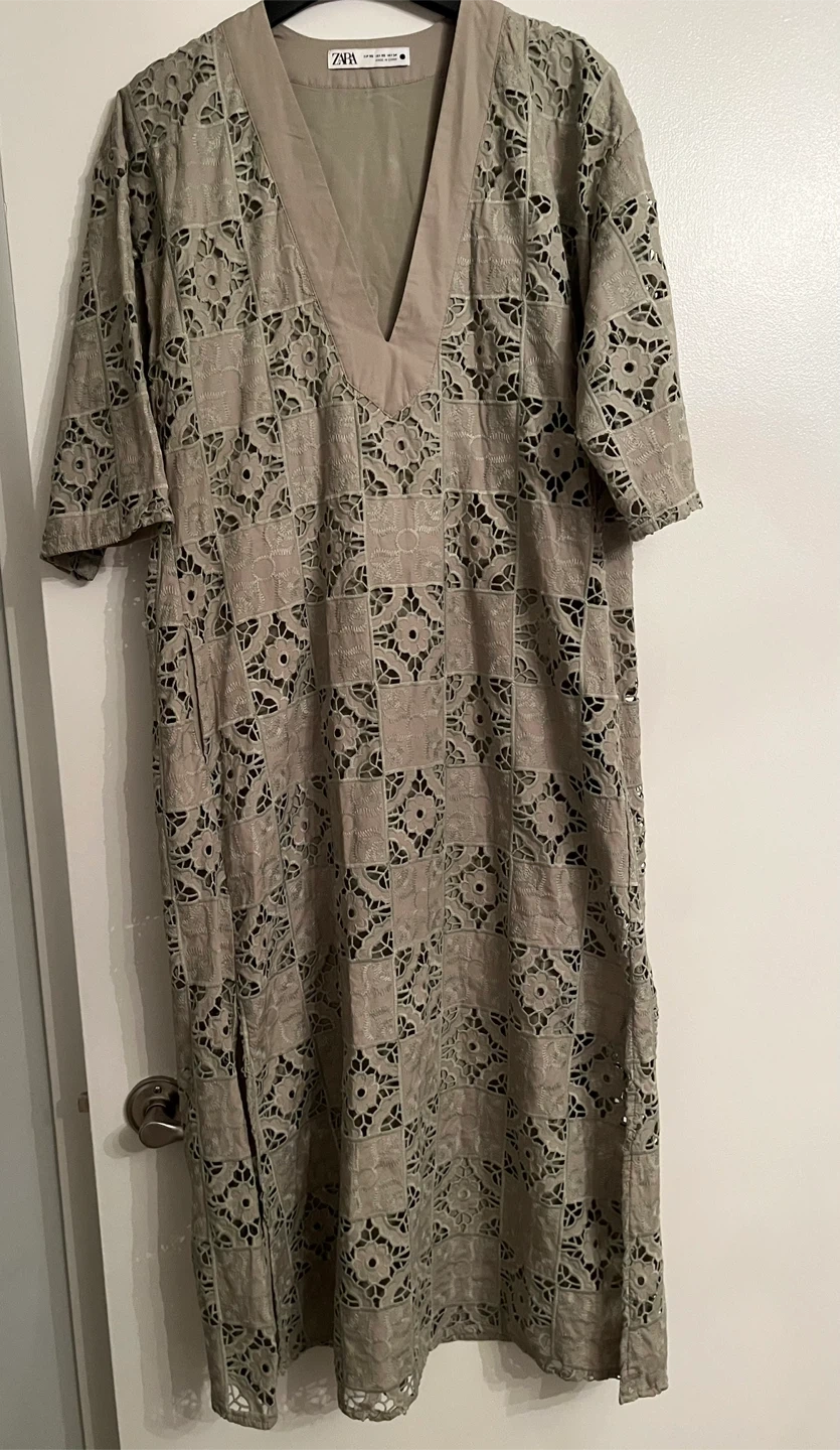 Kaftan style with deep v neck, side slits and pockets. Lined Cotton and polyester blend Lining is viscose Oversized fits small to medium