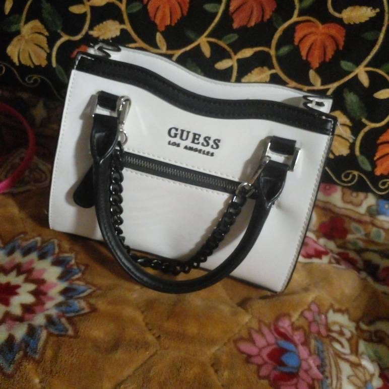 Guess Los Angeles handbag in white! It features black accents and a chain detail used 2 times but still in brand new condition