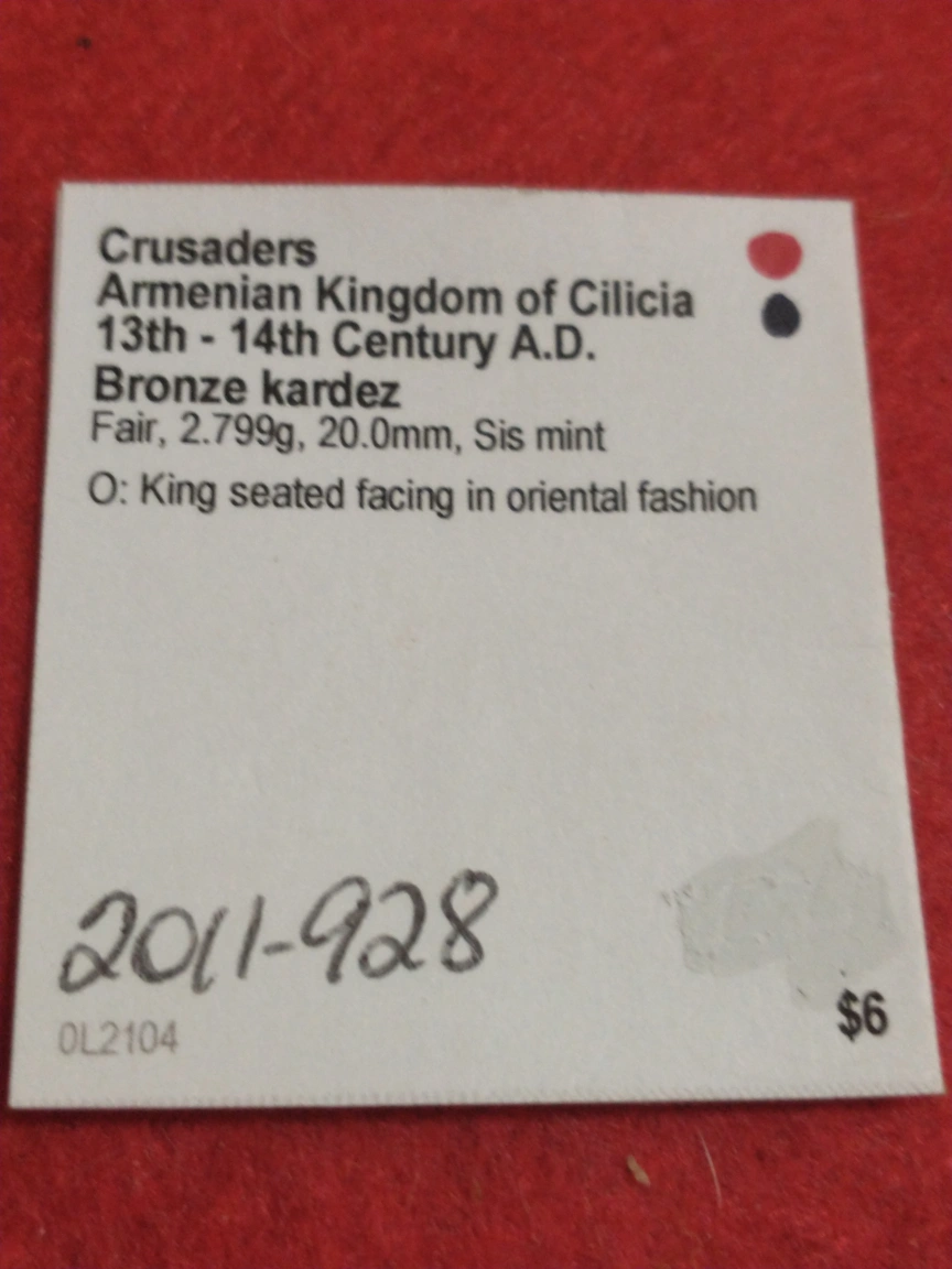 #2011-928 in MB. Crusaders Armenian Kingdom of Cilicia bronze kardez coin from the 13th-14th century A.D. It weighs 2.799g and is 20.0mm in size. The coin features a king seated facing in oriental fashion. Reverse is an encircled cross. It's in fair condition. Reputable online auctioneer Forum Ancient Coins valued this at $6. Slava Ukrayini! Please note, I am not a dealer nor business, I'm simply selling my collections spanning decades. I don't buy or trade, nor meet or deliver... all purchases can be picked up in the lobby of my building of residence at Broadview/Pottery. I will gladly ship most items but will not pay postage nor accept responsibility for loss. I welcome any questions but at the first sign of insolence or trolling, the messager will be blocked. I stand behind all my items and offer satisfaction guarantee or full refund. Please refer to my feedback stats which reflect my high customer satisfaction. Thank you. All my items come from a MAGA-free home