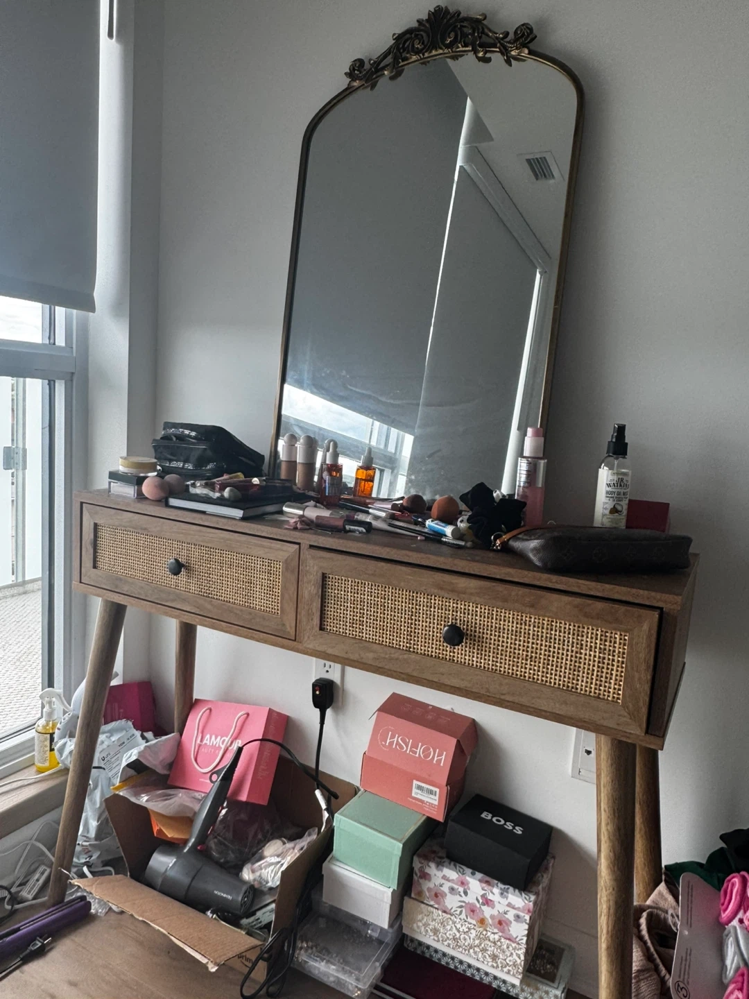 Selling a vanity table. It has a beautiful design and would be a great addition to any bedroom or dressing area. It features two drawers for storage. Bought 2 months ago