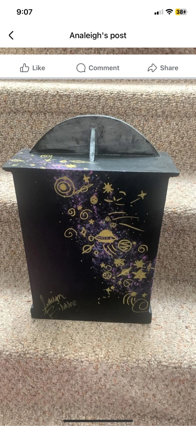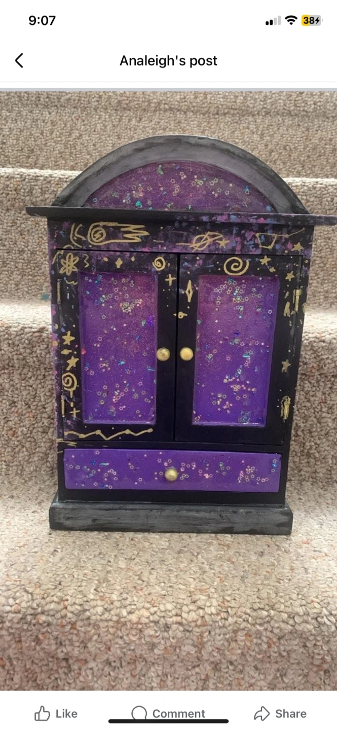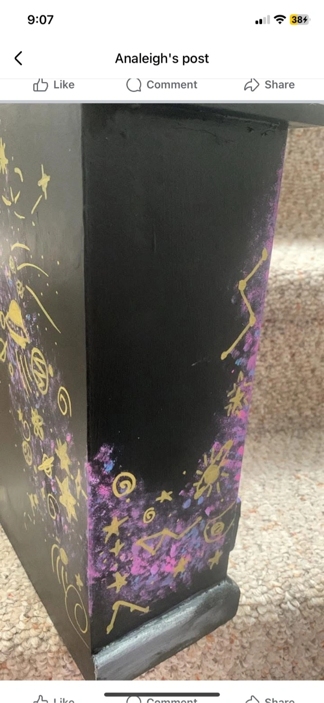 Selling a unique, hand-painted wooden jewelry box. It features a celestial design with stars and planets in gold against a purple and black background. It has a small drawer and a cabinet with double doors, perfect for storing your favourite pieces