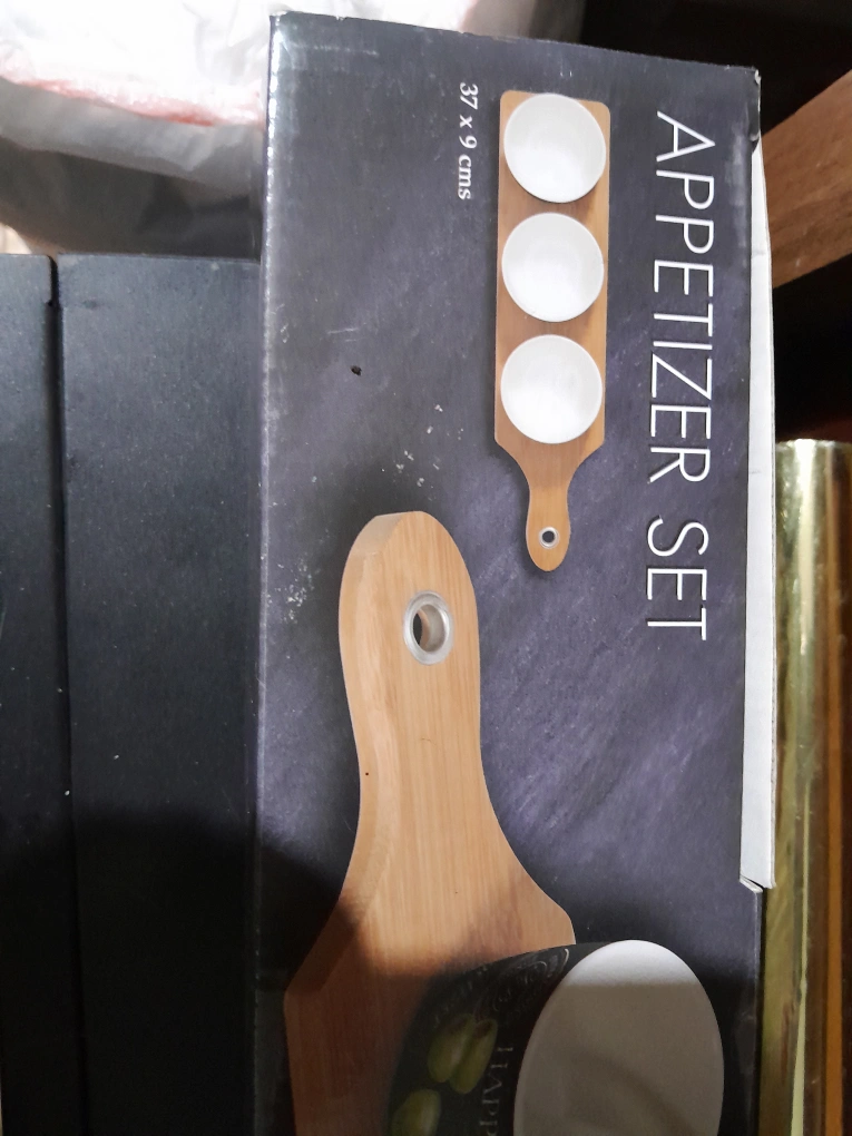 Selling a brand new appetizer set! It comes with three bowls and a wooden serving board. The set is still in its original box, ready for your next gathering or a thoughtful gift