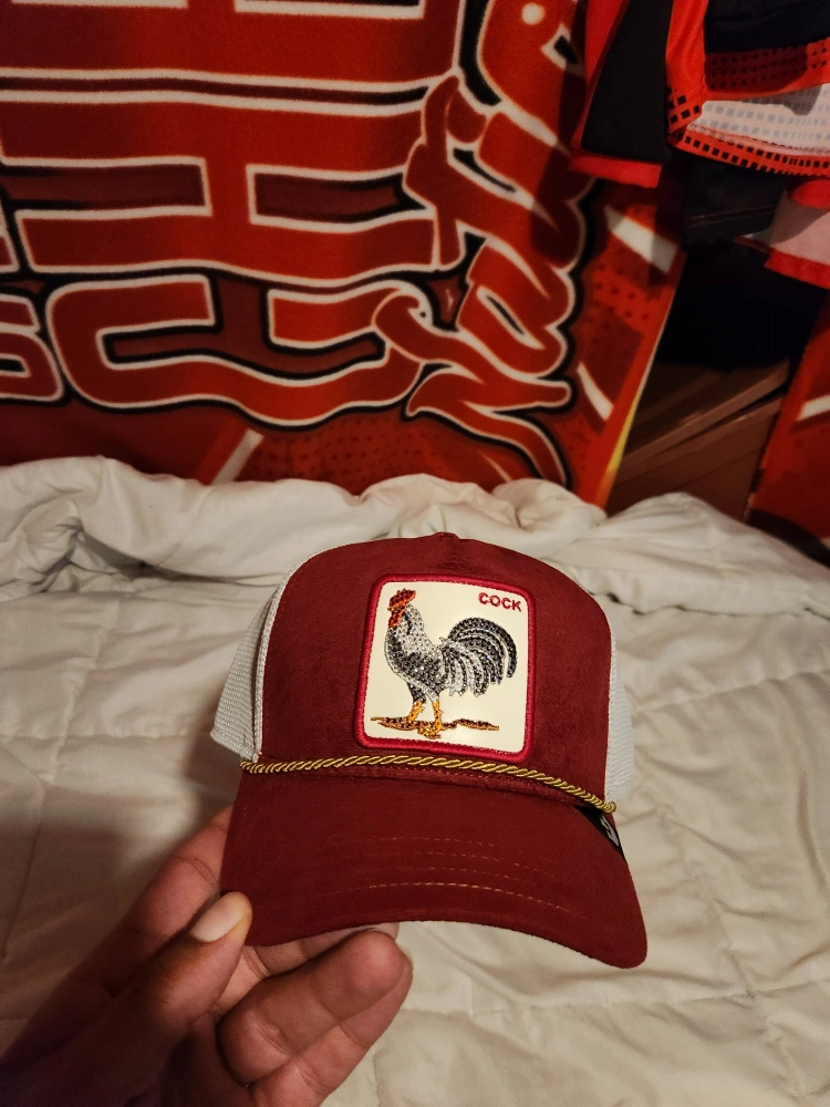 This Goorin Bros Garnet Rooster Rope Trucker hat is in great condition! It's a stylish and unique accessory that's sure to turn heads. The hat features a cool rooster design and a rope detail, adding a touch of flair. Originally bought for $76.99
