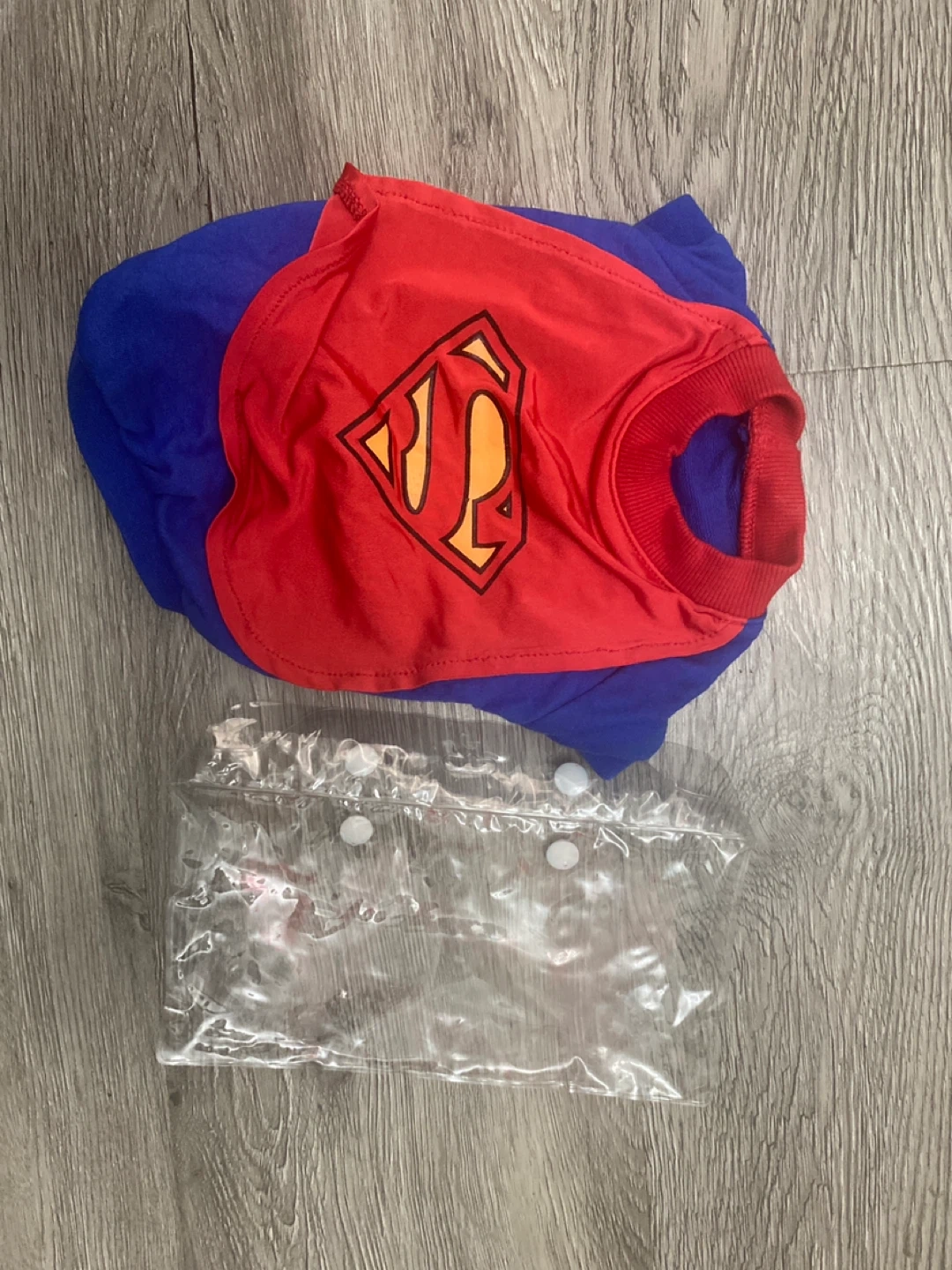 Selling a XS Superman dog costume! It's a vibrant blue and red, featuring the classic Superman logo. Comes in its original packaging