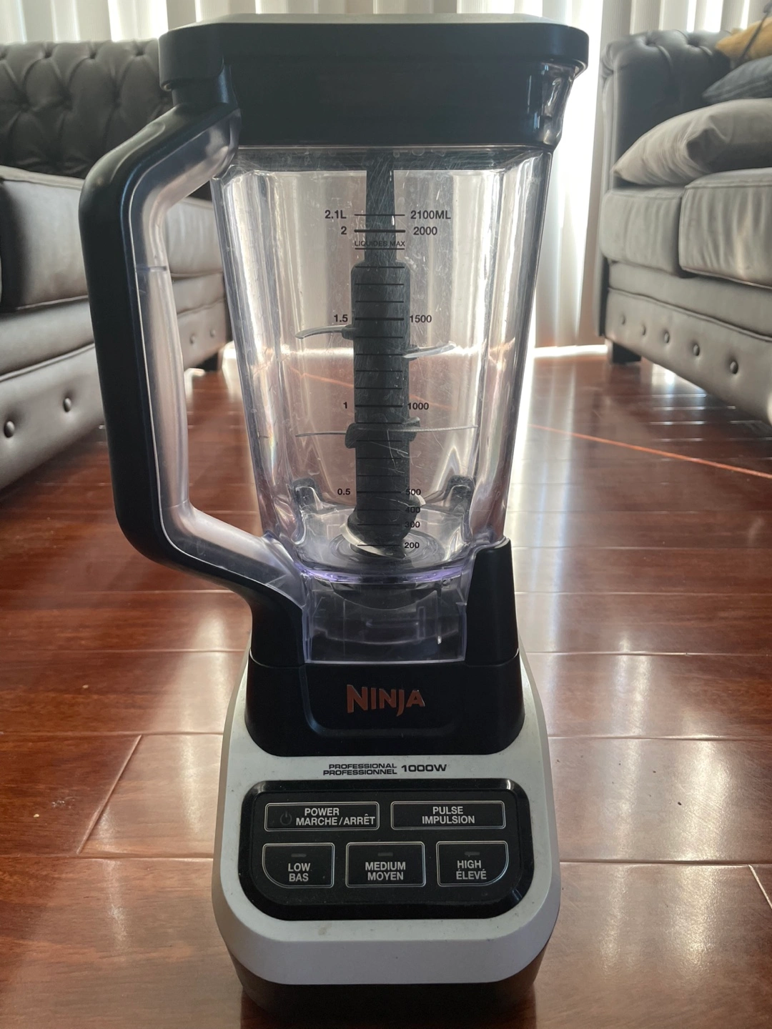 Selling a Ninja Professional 1000W blender! It's in great shape and ready to make smoothies, soups, and more. The pitcher has a 2.1L capacity, perfect for larger batches. It features power and pulse settings, with low, medium, and high speeds for all your blending needs