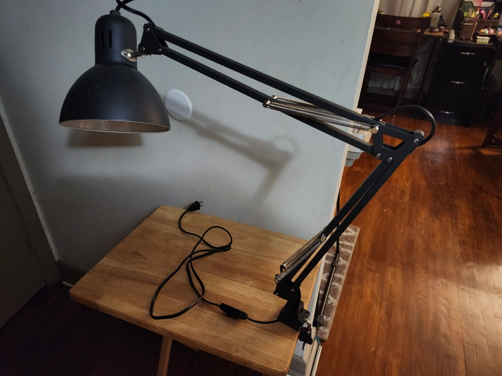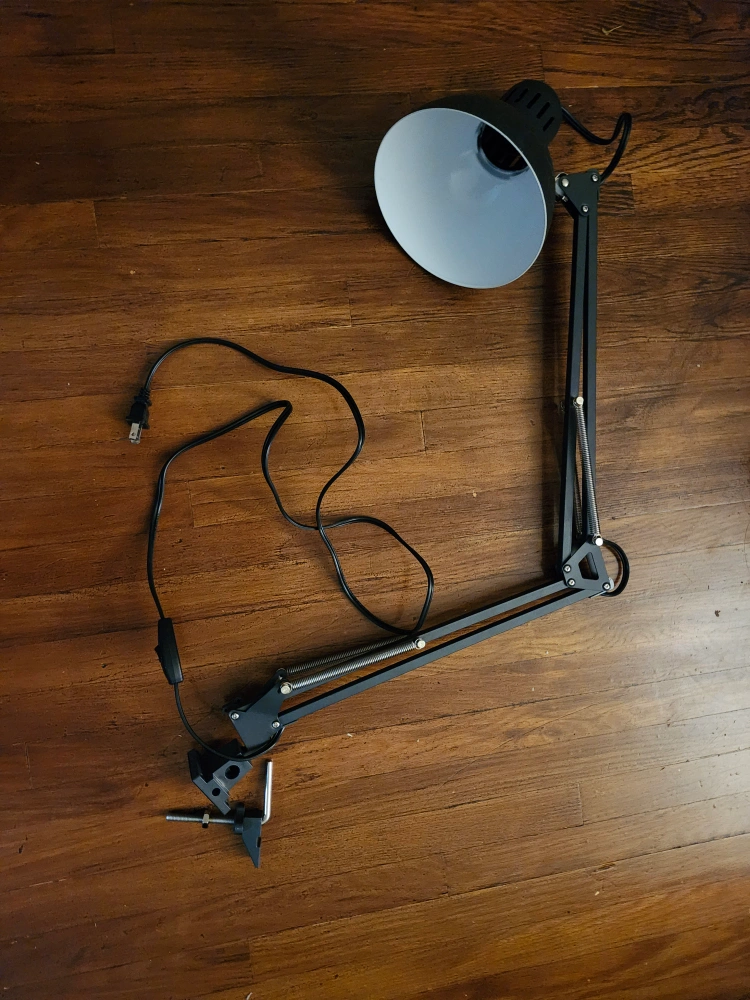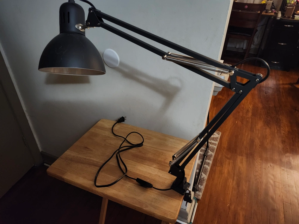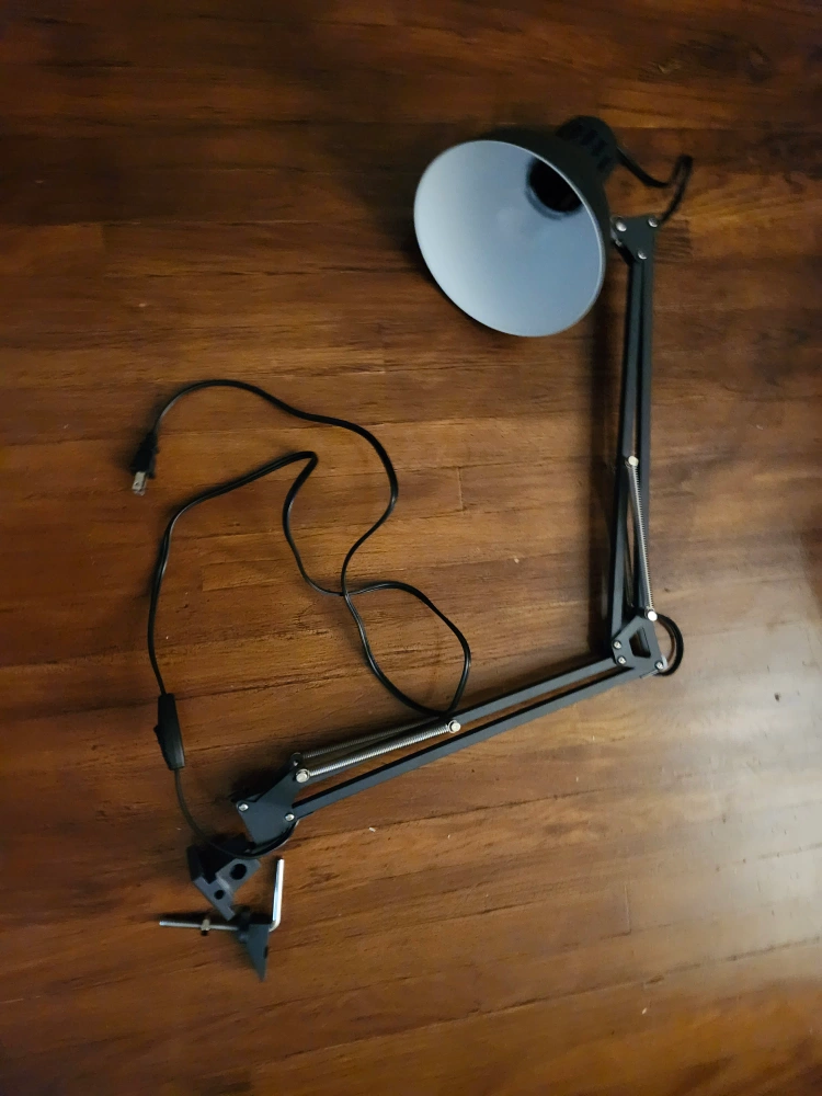 Selling a black adjustable architect desk lamp! It's in great shape and ready to brighten up your workspace or reading nook. The lamp features an adjustable arm and a clamp for easy attachment to your desk or table. Perfect for students, artists, or anyone who needs focused lighting