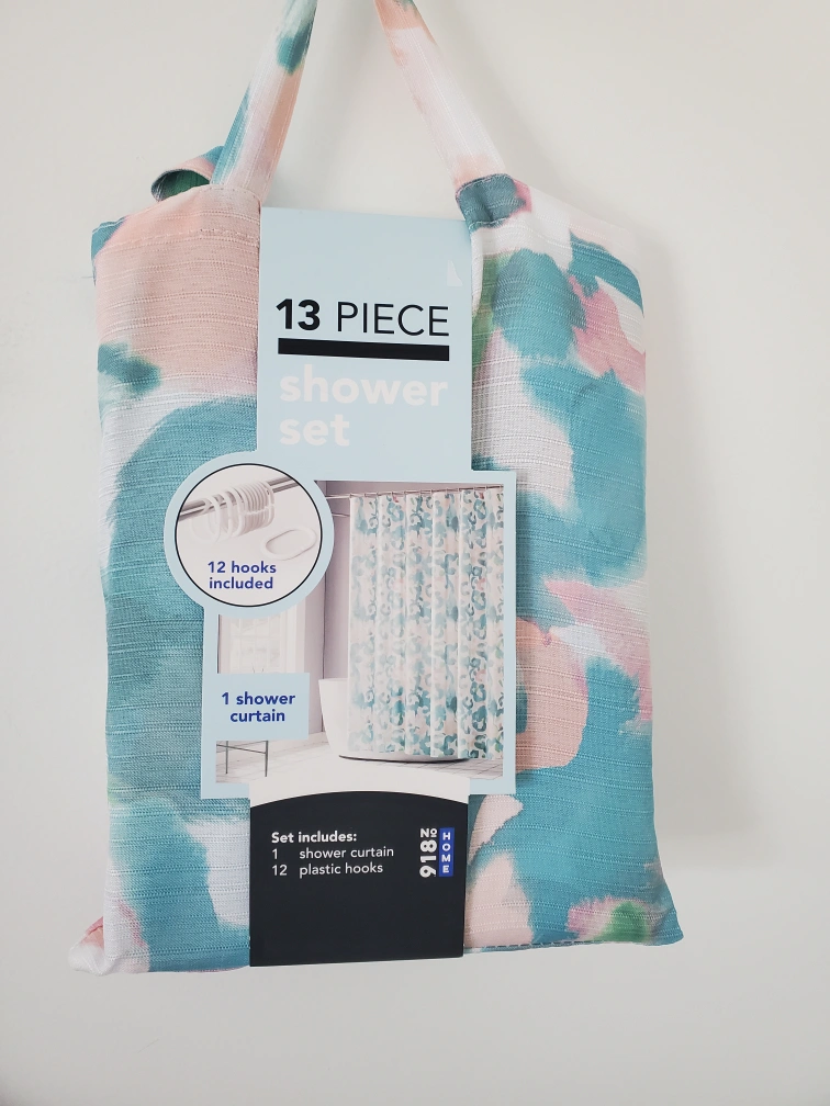This is a brand new 13-piece shower set. It includes: - 1 shower curtain (70 in x 72 in / 178 cm x 183 cm) - 12 plastic shower hooks The fabric content is 100% polyester and it is machine washable. See care label for washing instructions