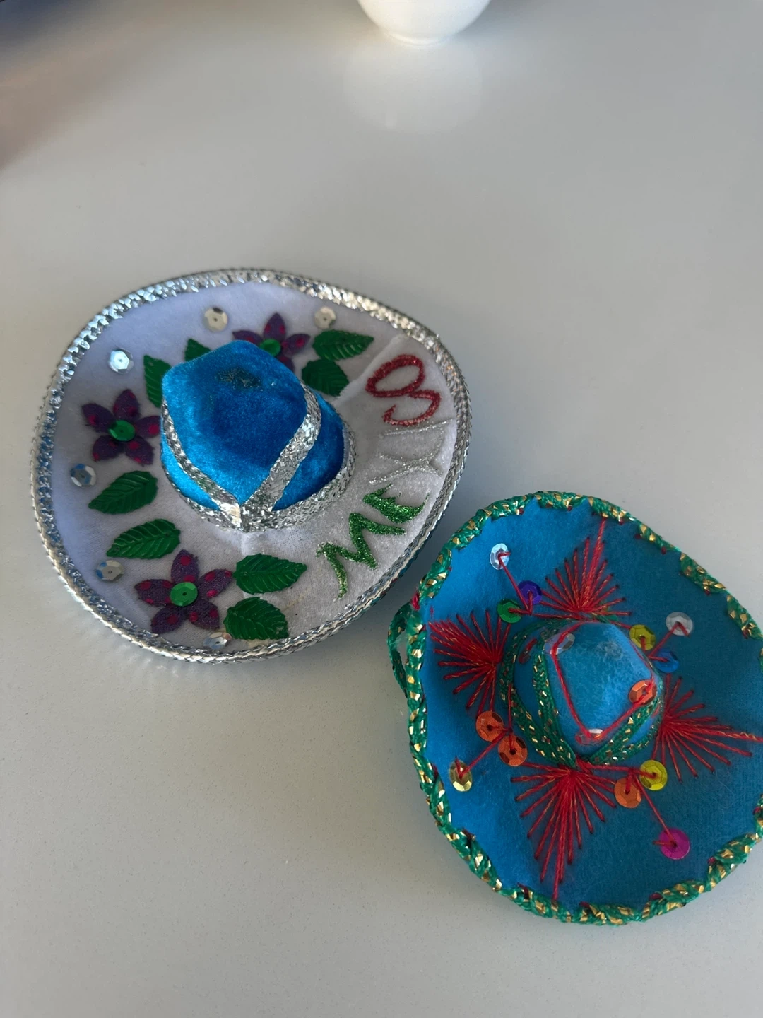 Two adorable miniature sombrero hats, perfect for fiesta decorations or quirky crafts! One is white with silver trim and colourful floral accents, while the other is vibrant blue with gold sequin detailing. Add a fun touch to your next gathering!